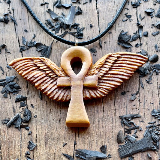 Ankh with Wings Necklace, Handmade Olive Wood Pendant