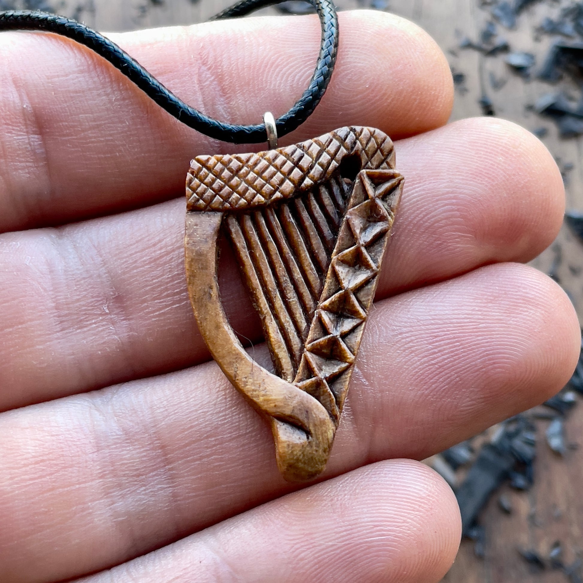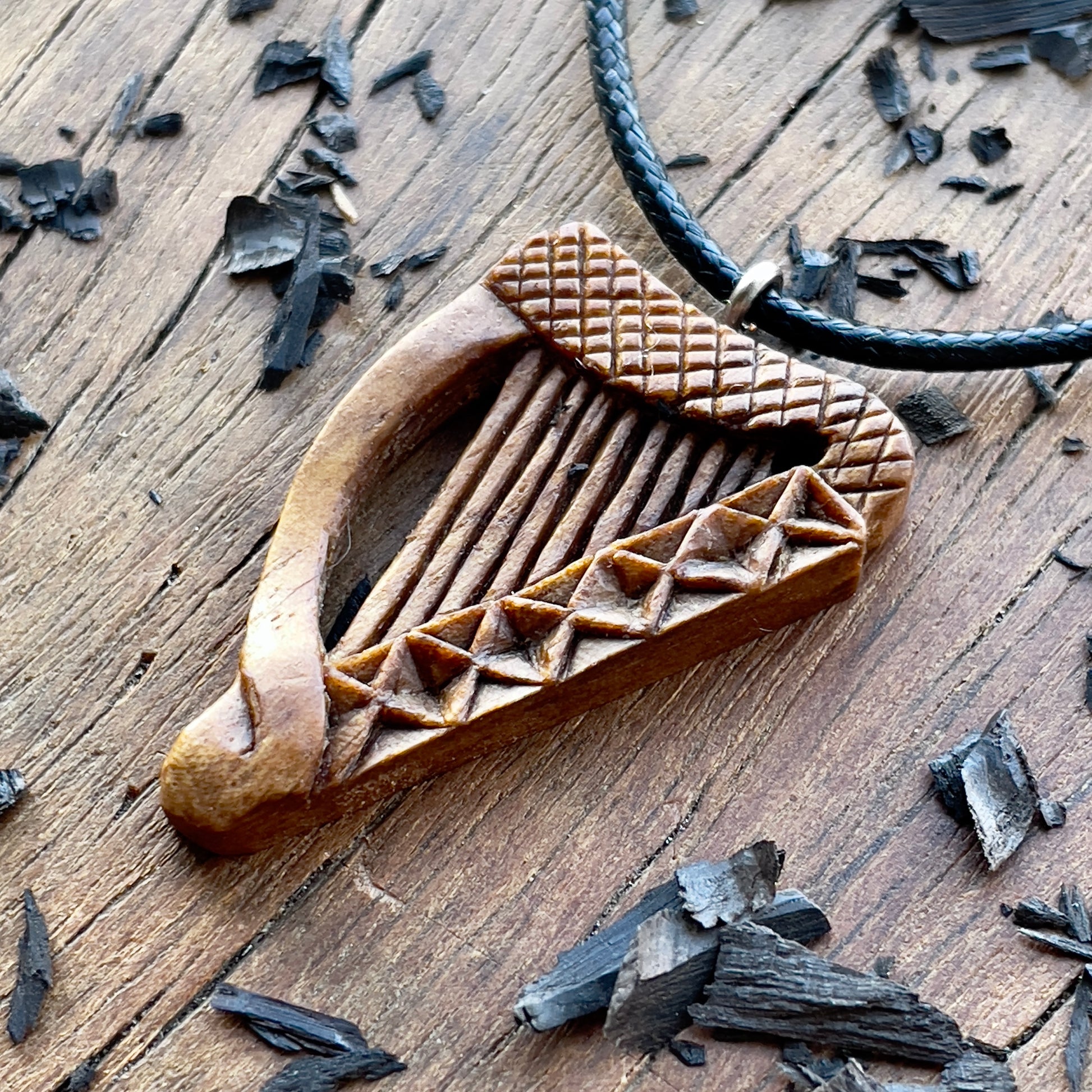 Ciondolo in legno di noce con arpa celtica