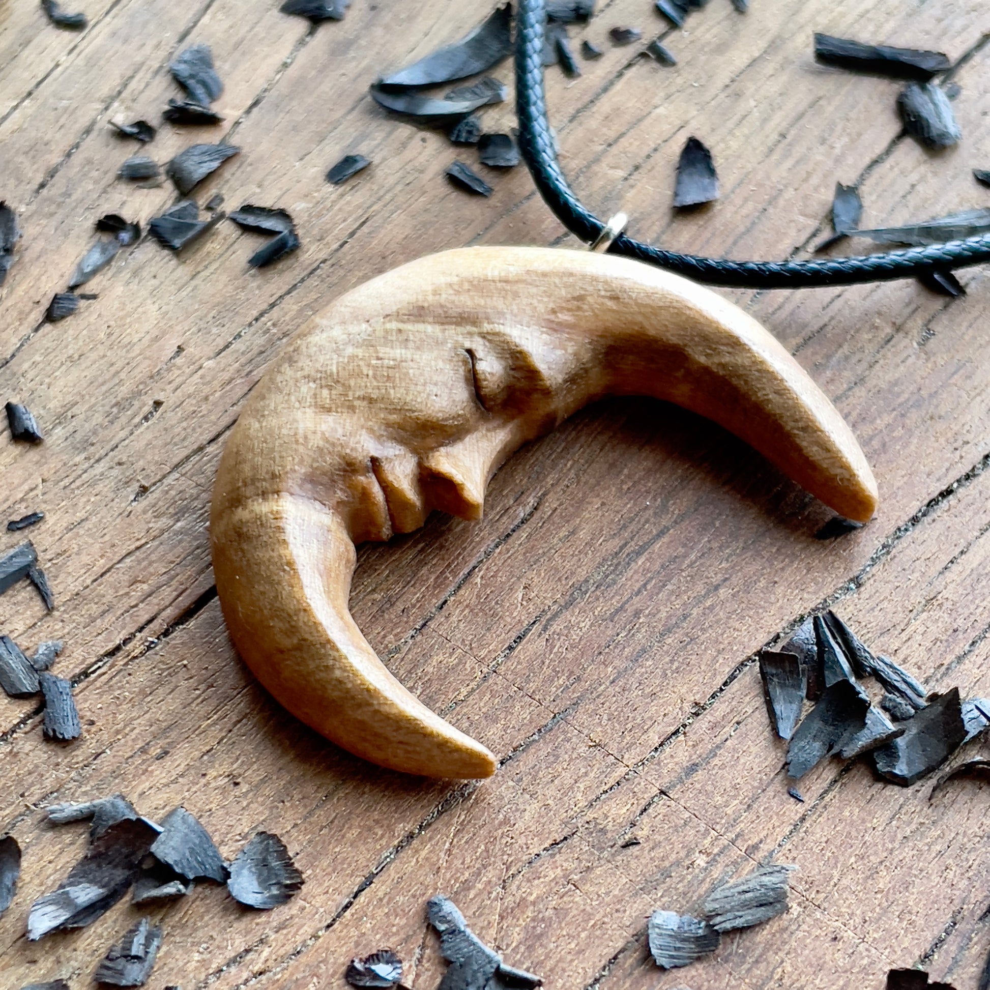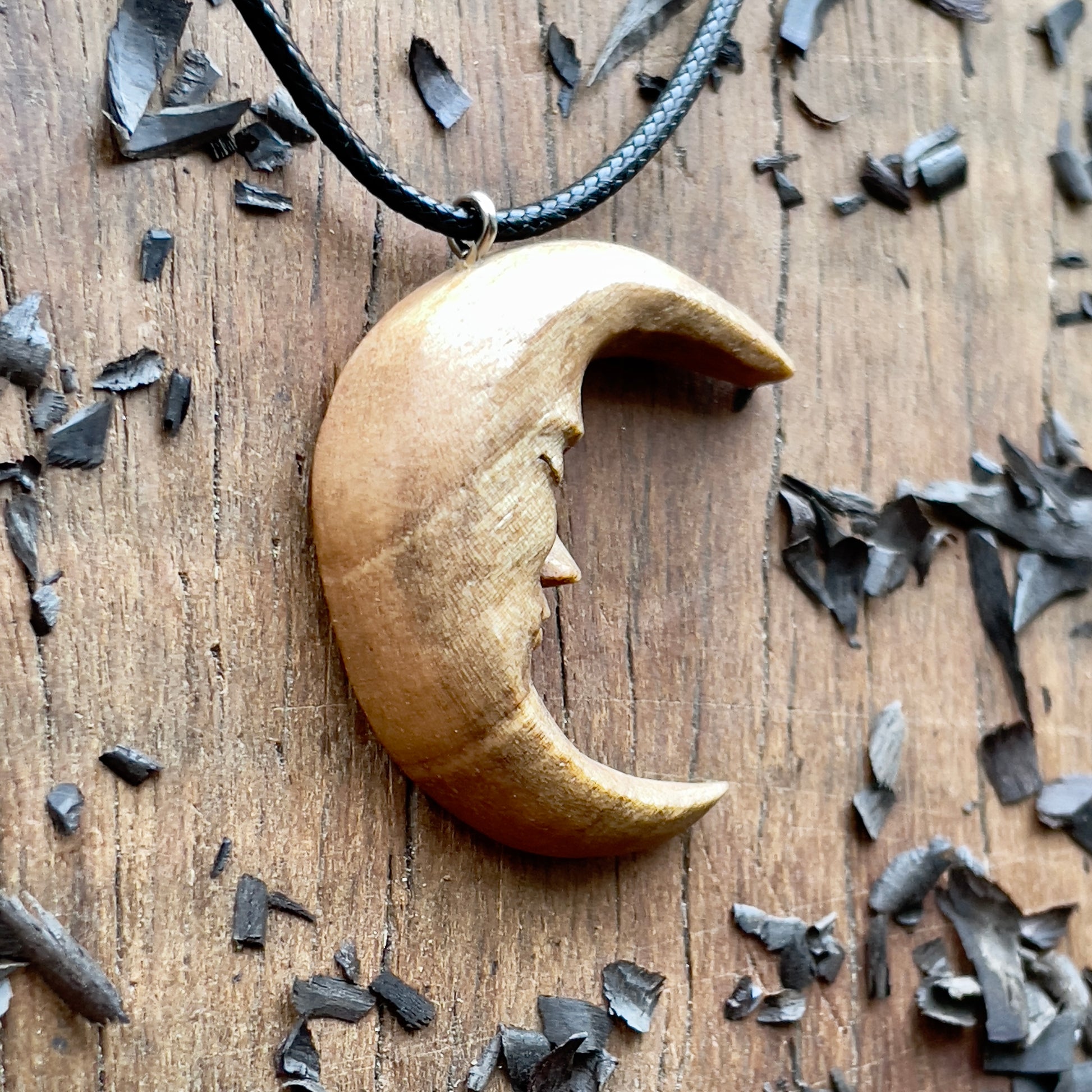 Questo splendido pendente unico e dettagliato che rappresenta la Luna con il volto, è intagliato a mano in legno di noce italiano. Tutti i dettagli della collana sono intagliati con coltello e sgorbie.