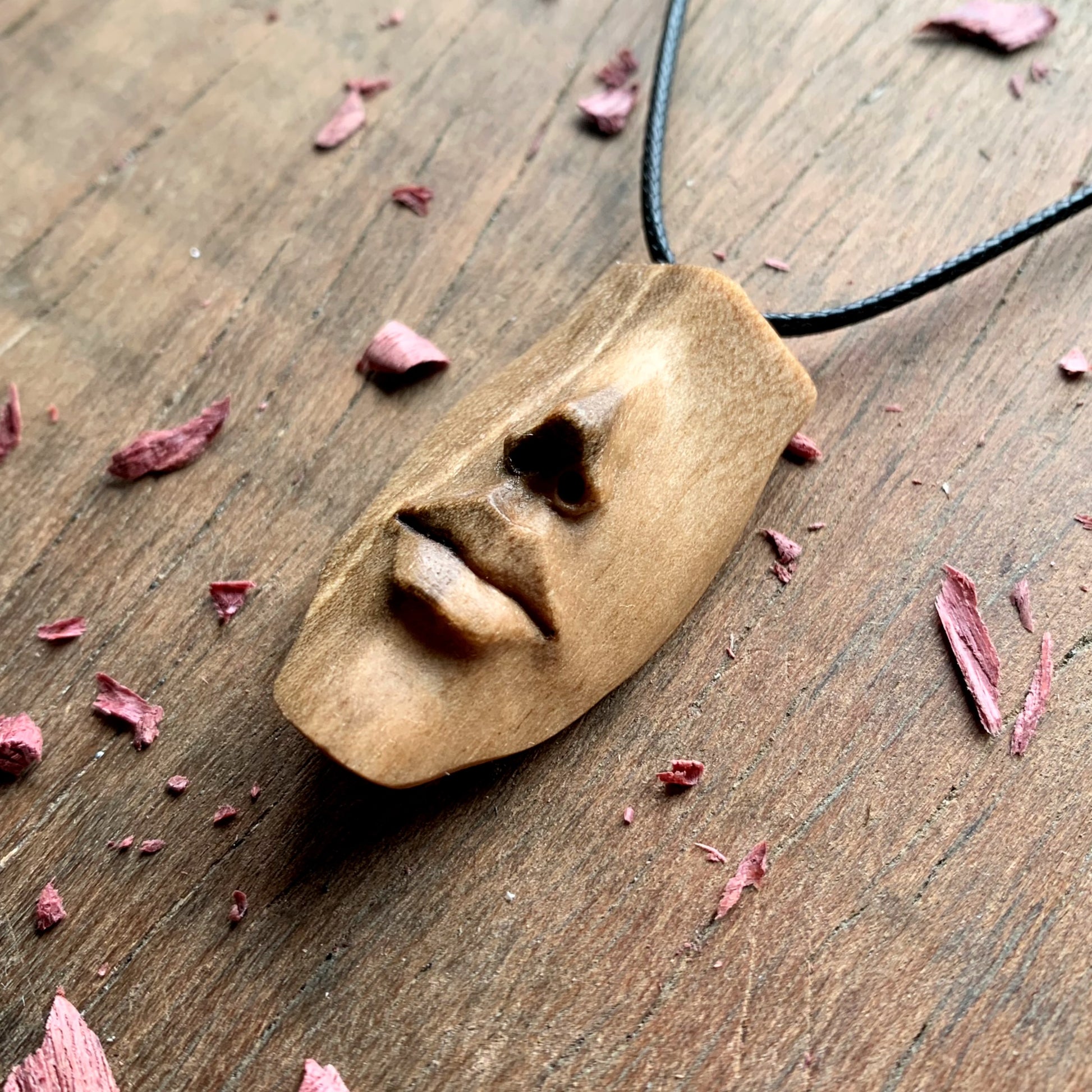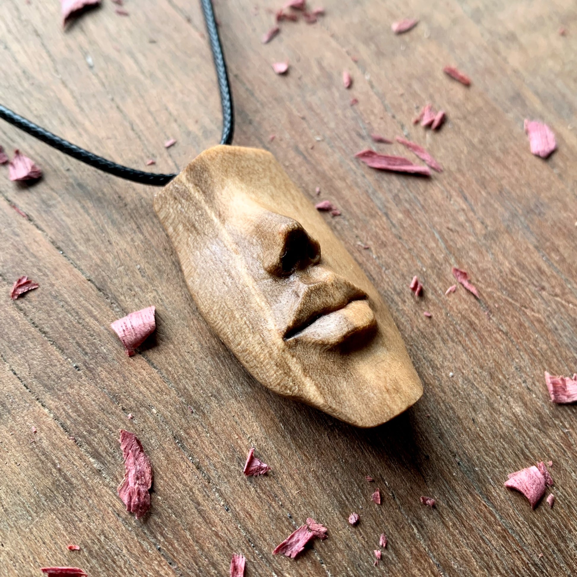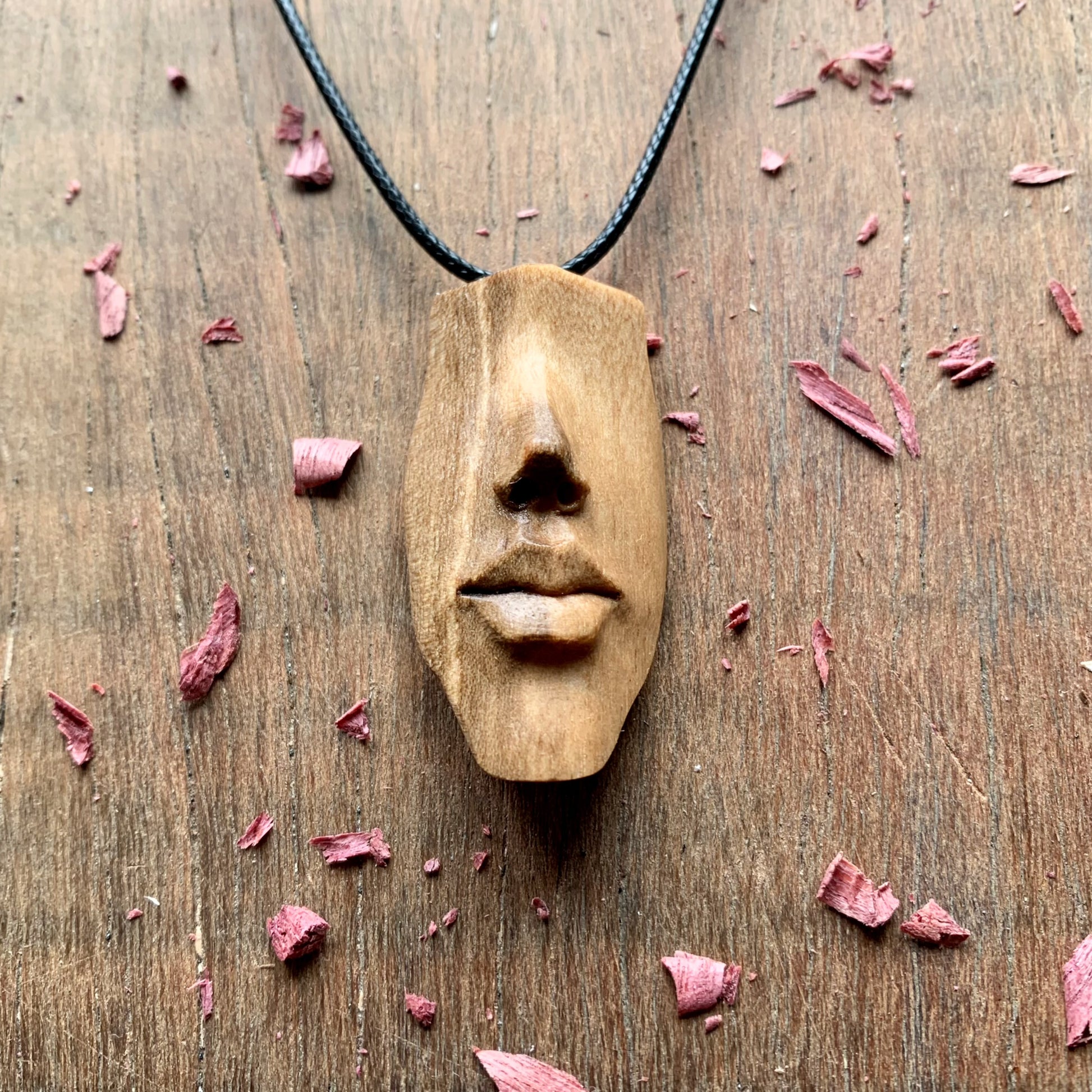 Questo splendido ciondolo con naso e labbra è intagliato a mano in legno di noce italiano. Tutti i dettagli della collana sono intagliati con coltello e sgorbie.