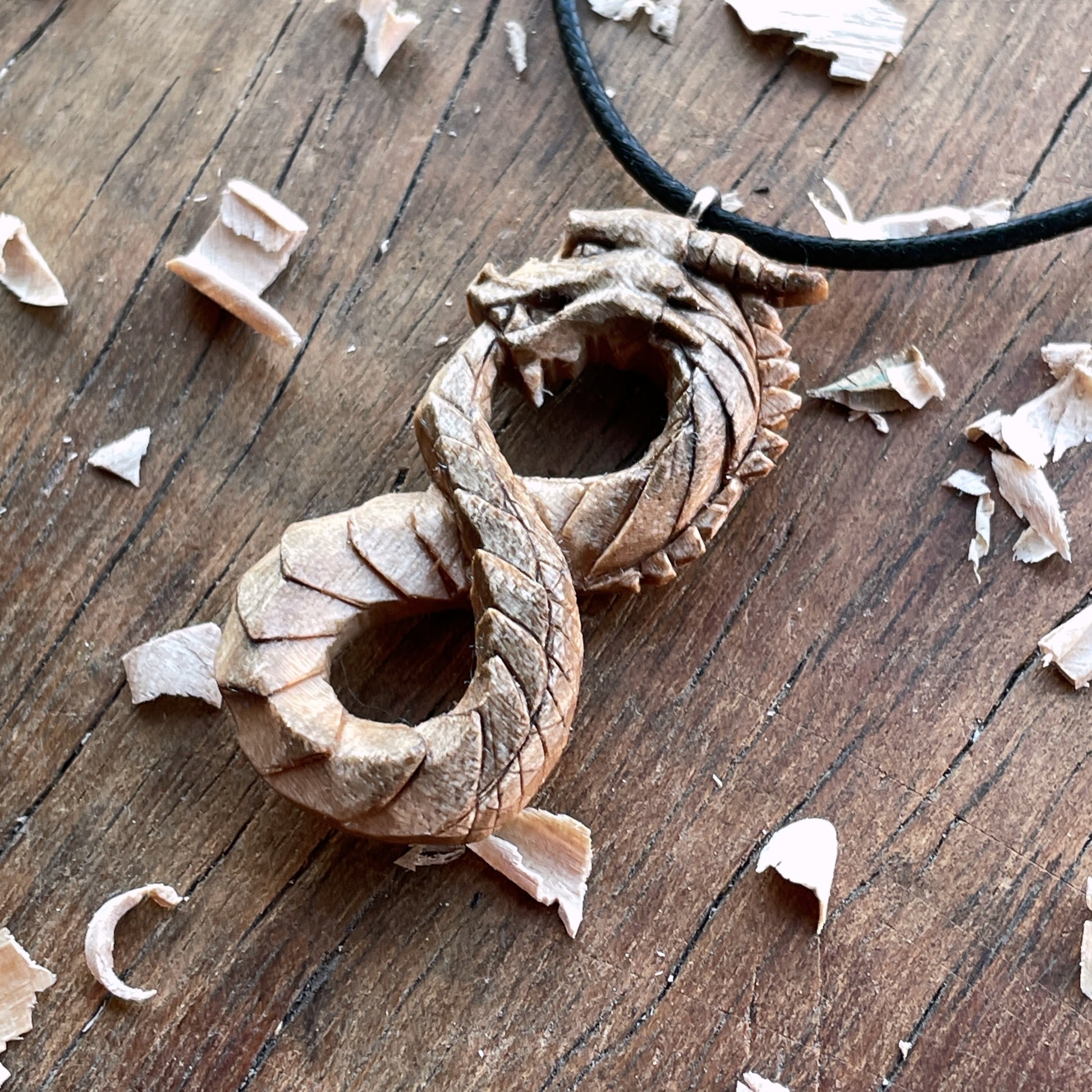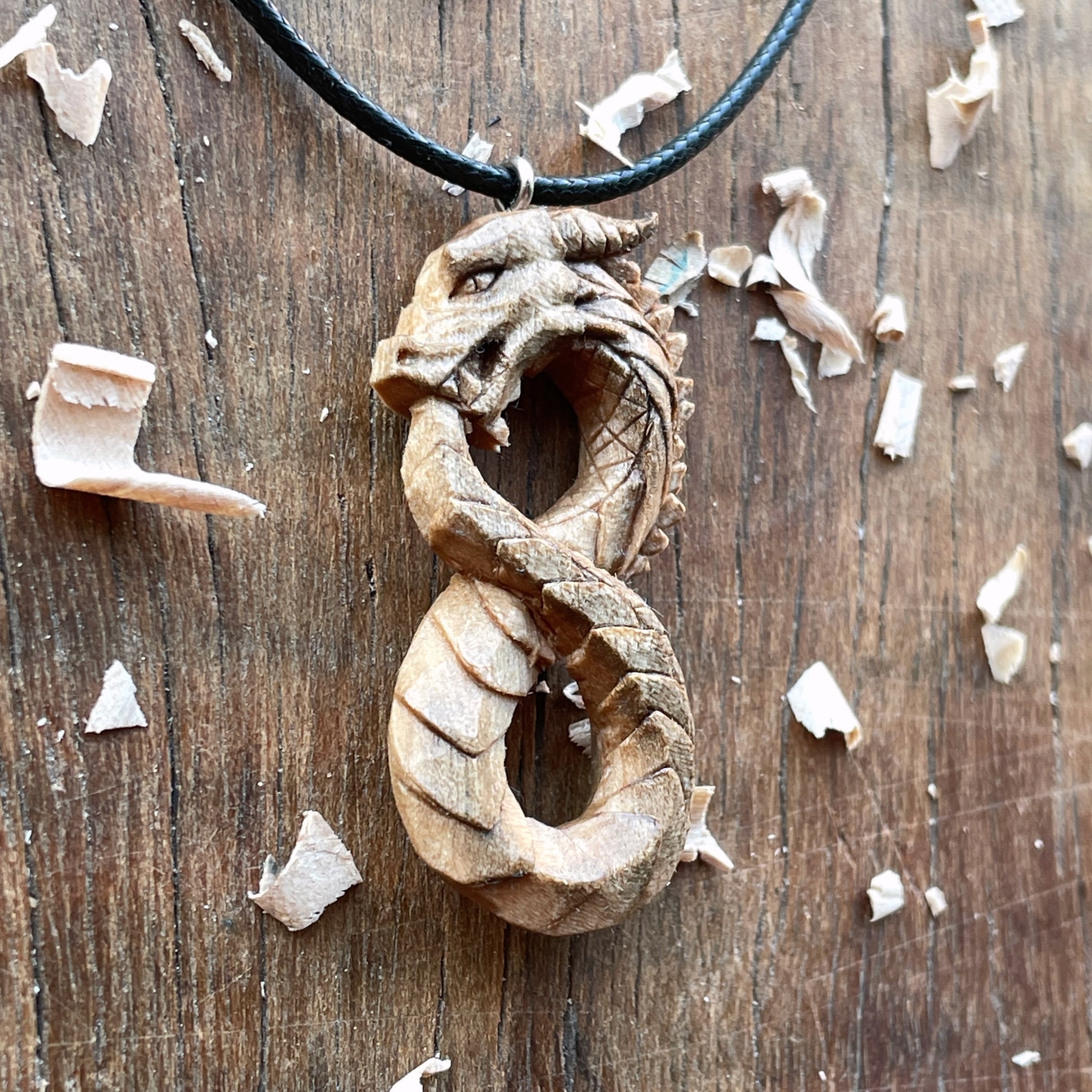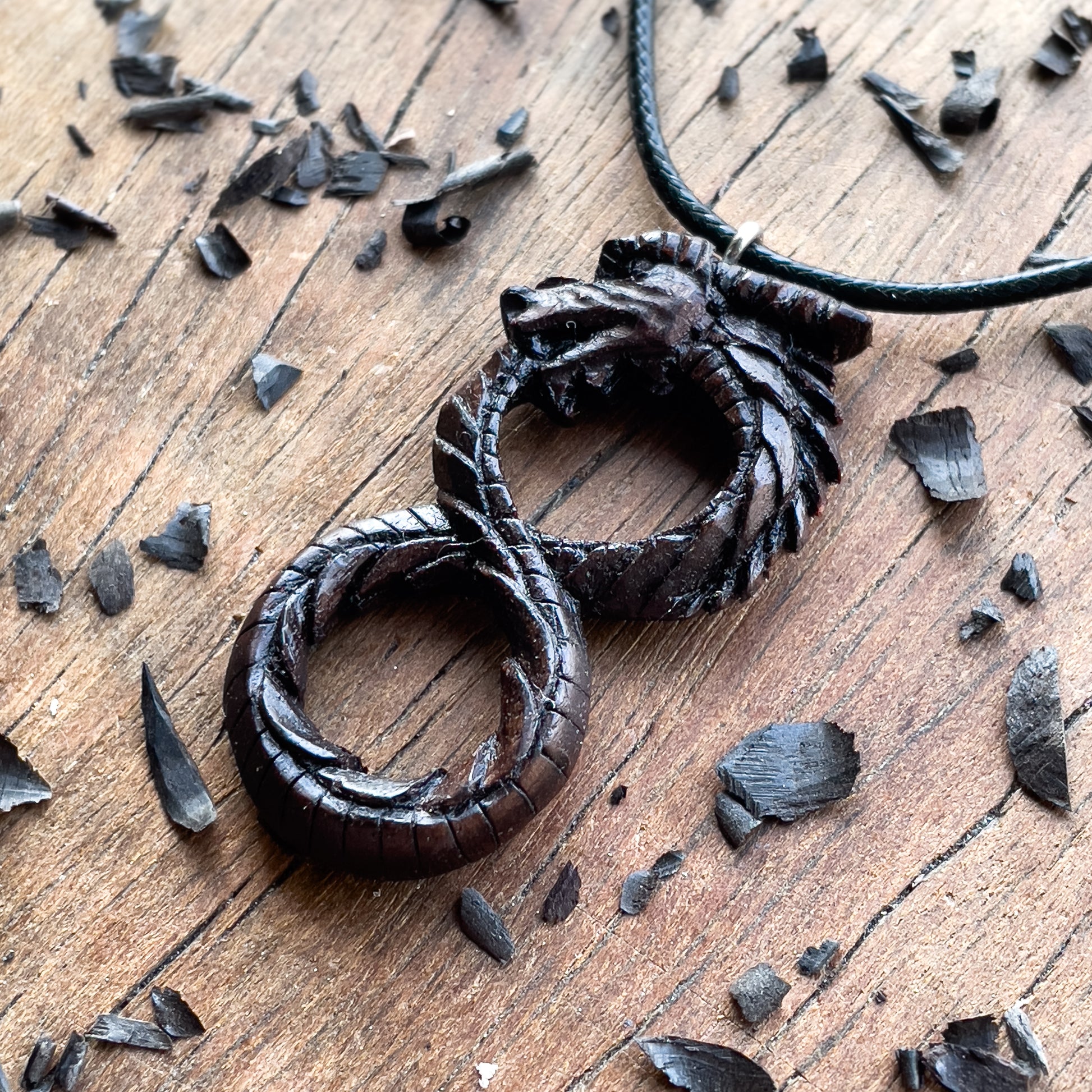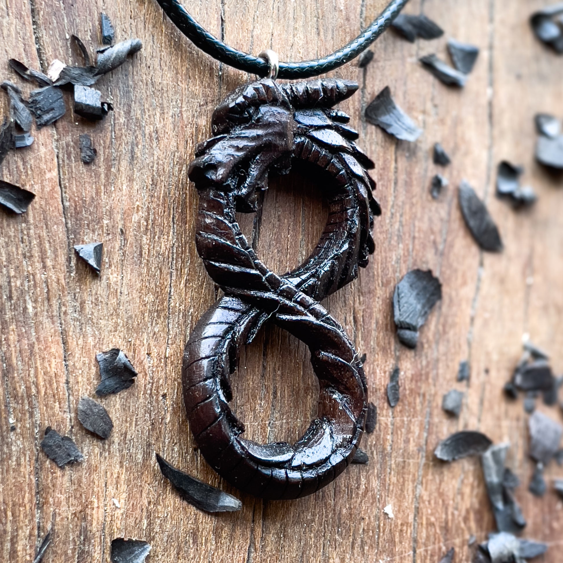 Questo splendido ciondolo a forma di drago Ouroboros è intagliato a mano in legno di noce americano. Tutti i dettagli della collana sono intagliati con coltello e sgorbie.