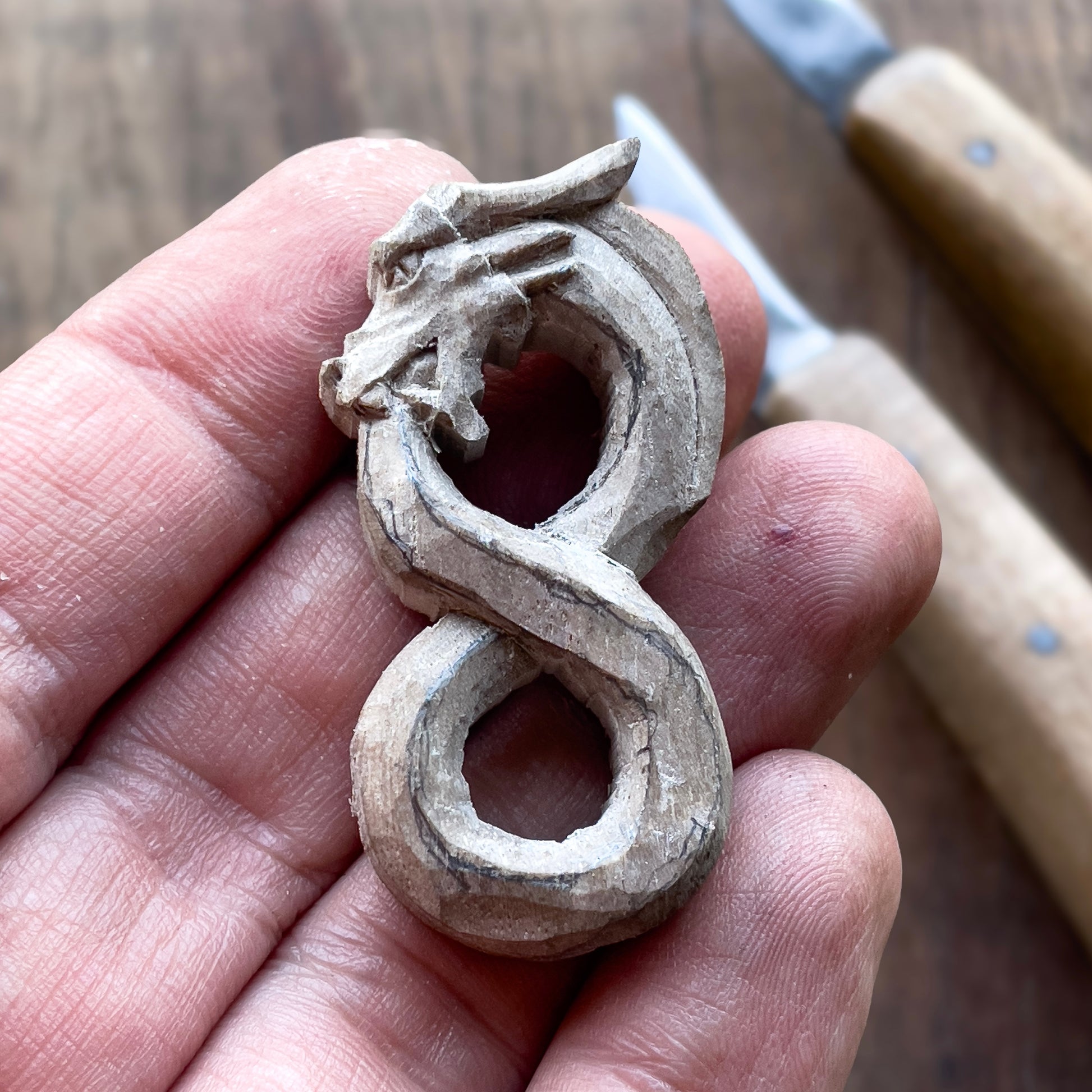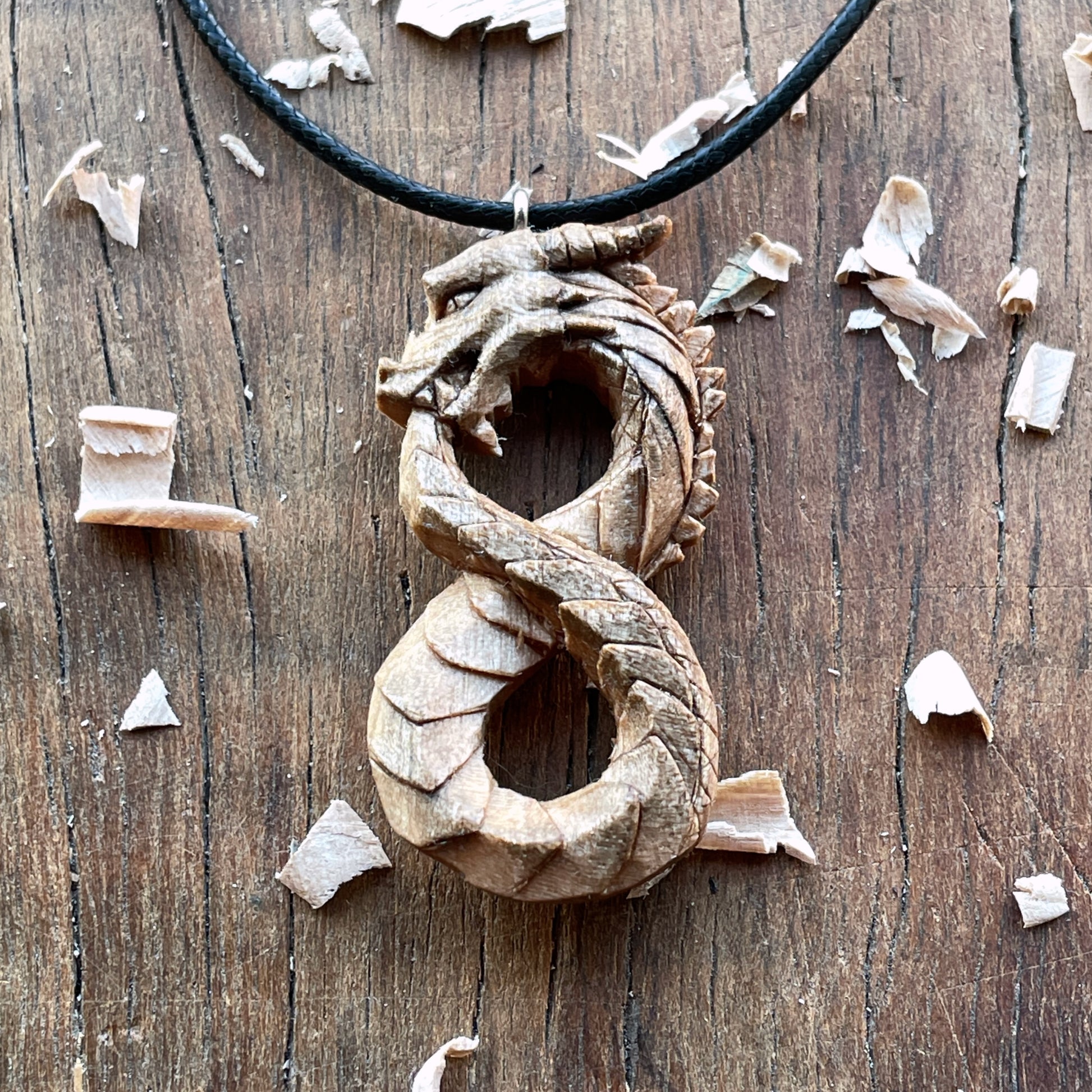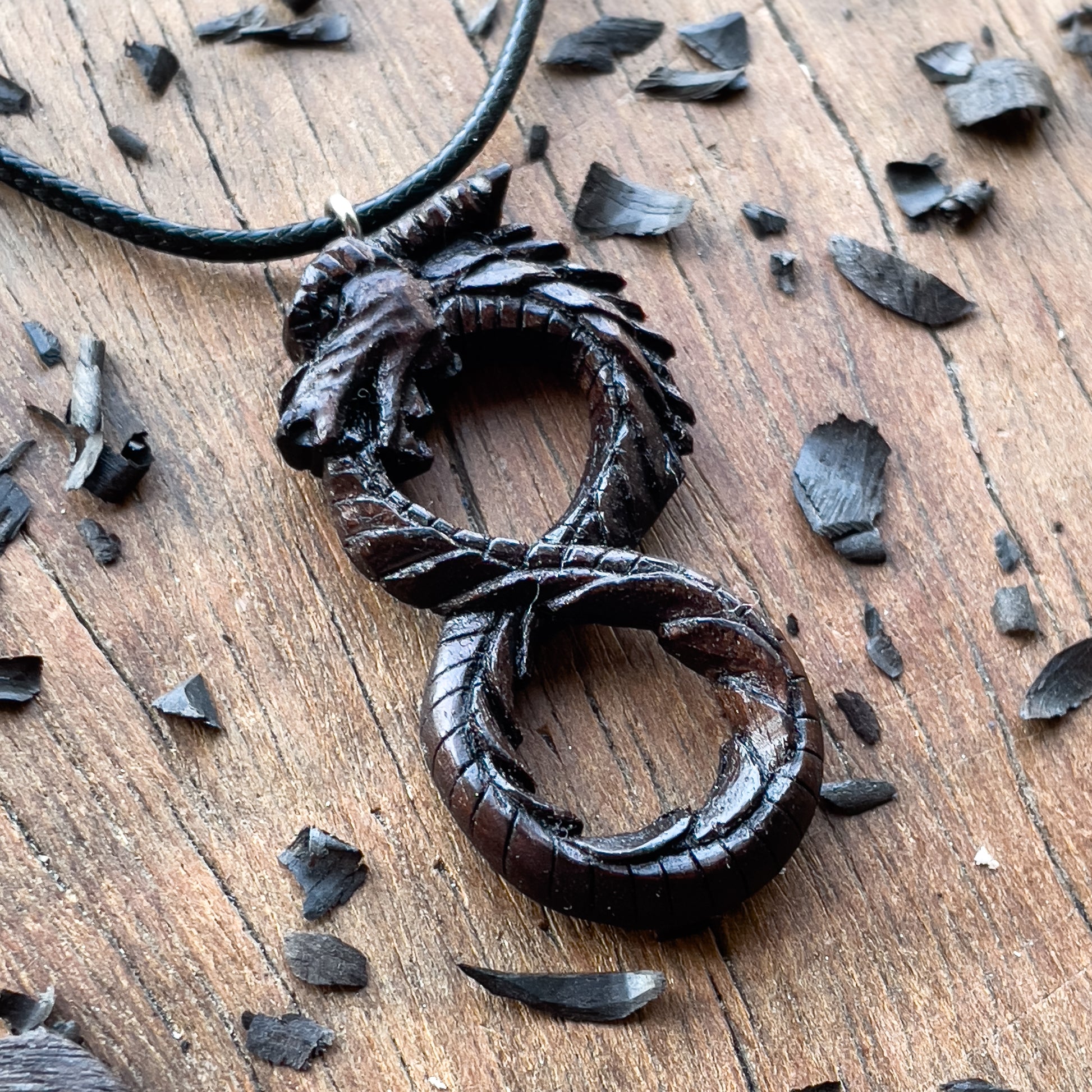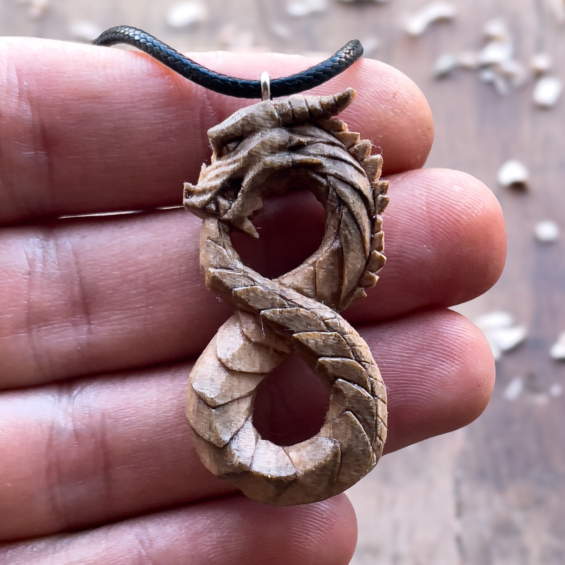 Questo splendido ciondolo a forma di drago Ouroboros è intagliato a mano in legno di noce americano. Tutti i dettagli della collana sono intagliati con coltello e sgorbie.