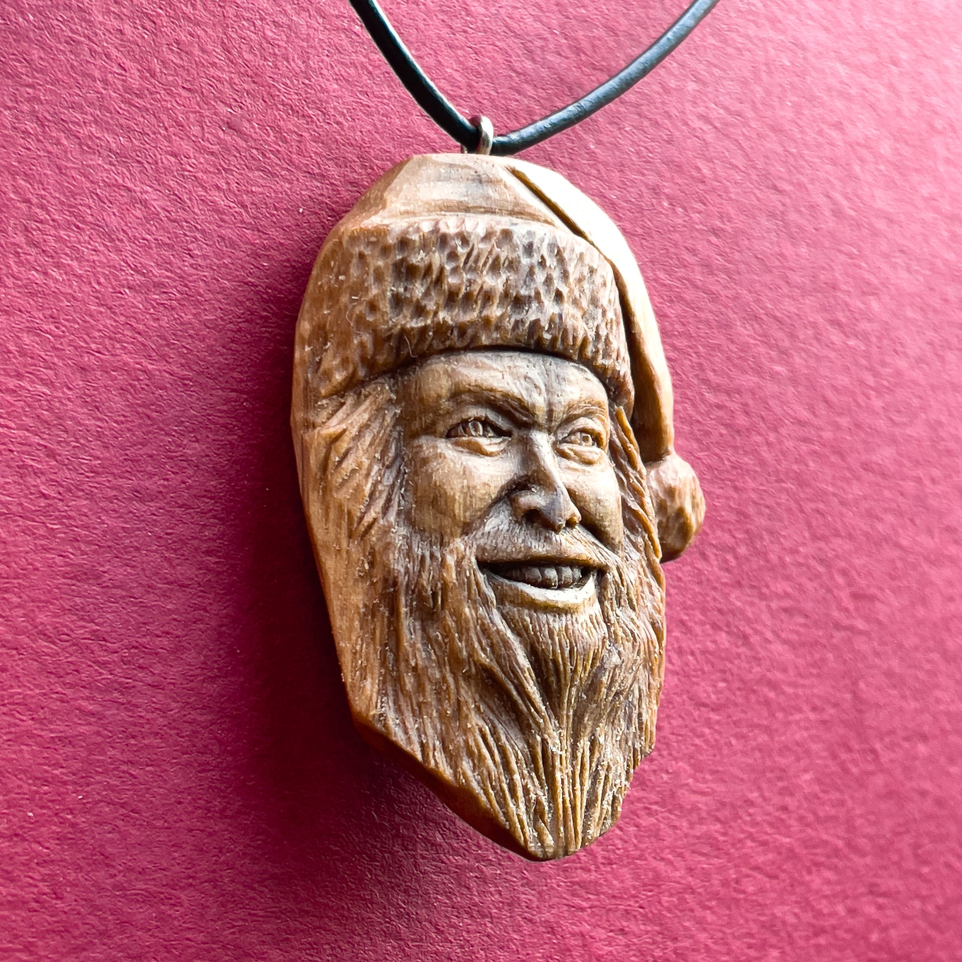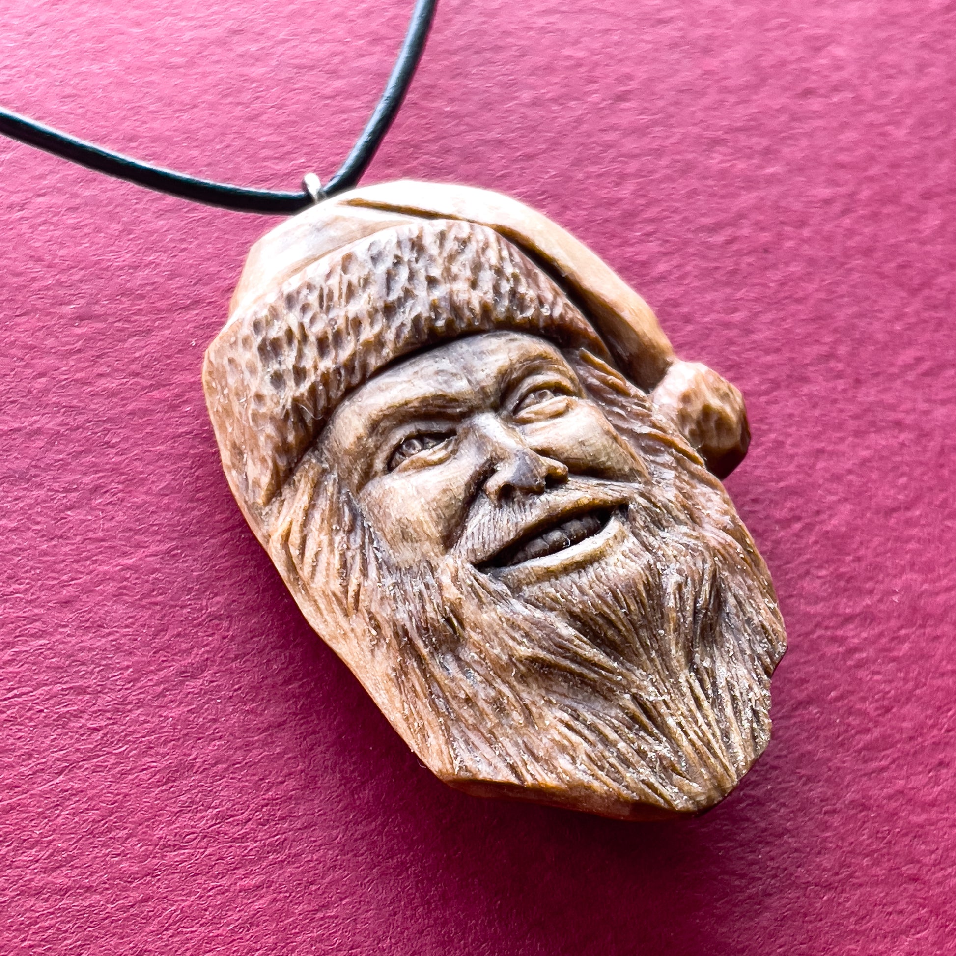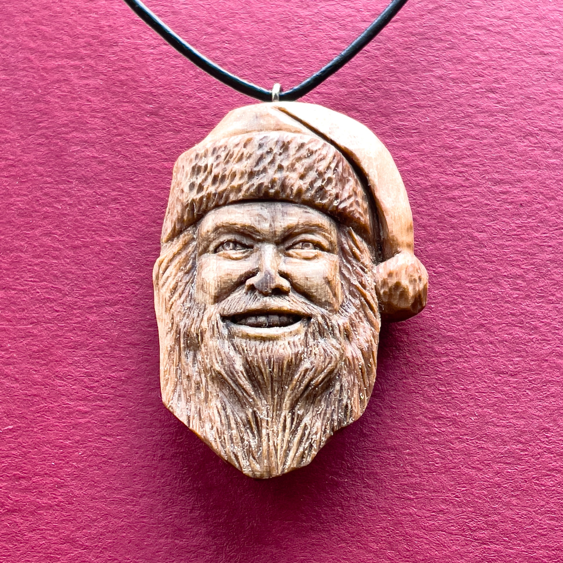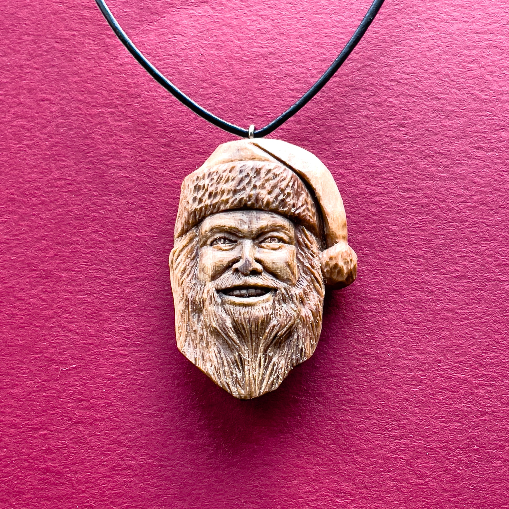 Questo splendido pendente unico con dettagli realistici che rappresenta il volto di Babbo Natale, è intagliato a mano in legno italiano. Tutti i dettagli della collana sono intagliati con coltello e sgorbie.