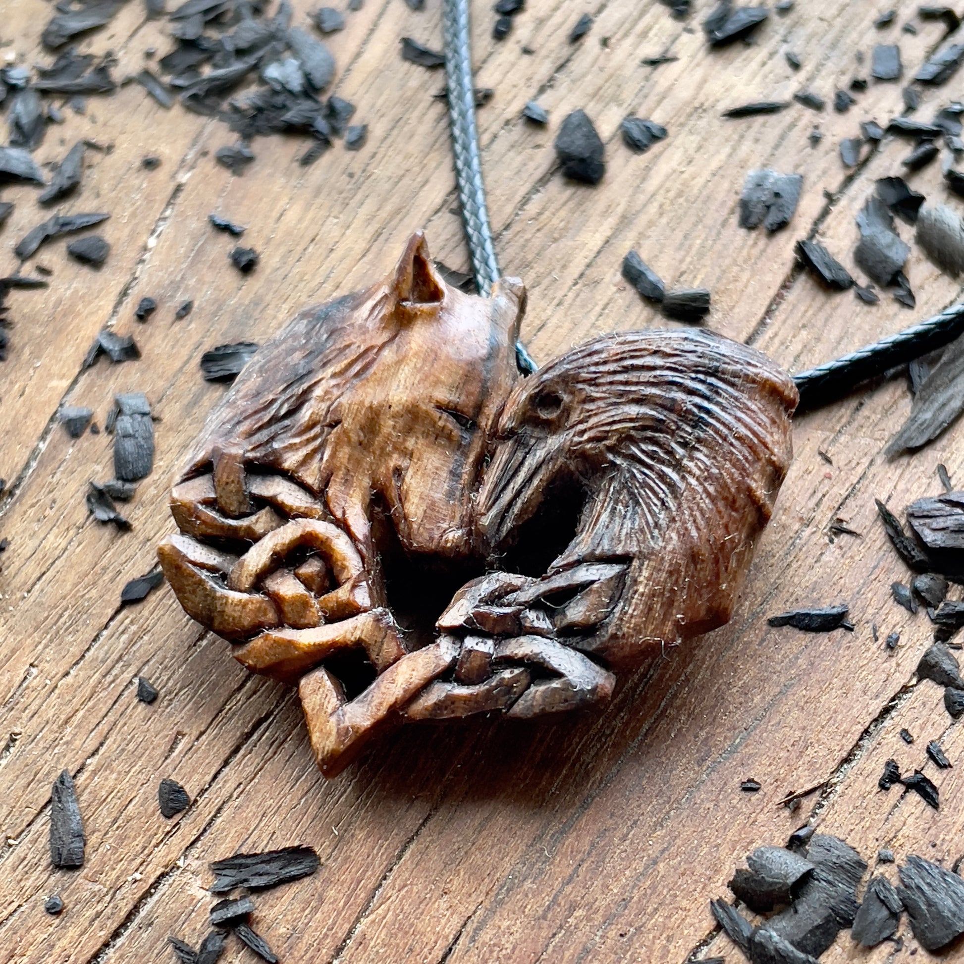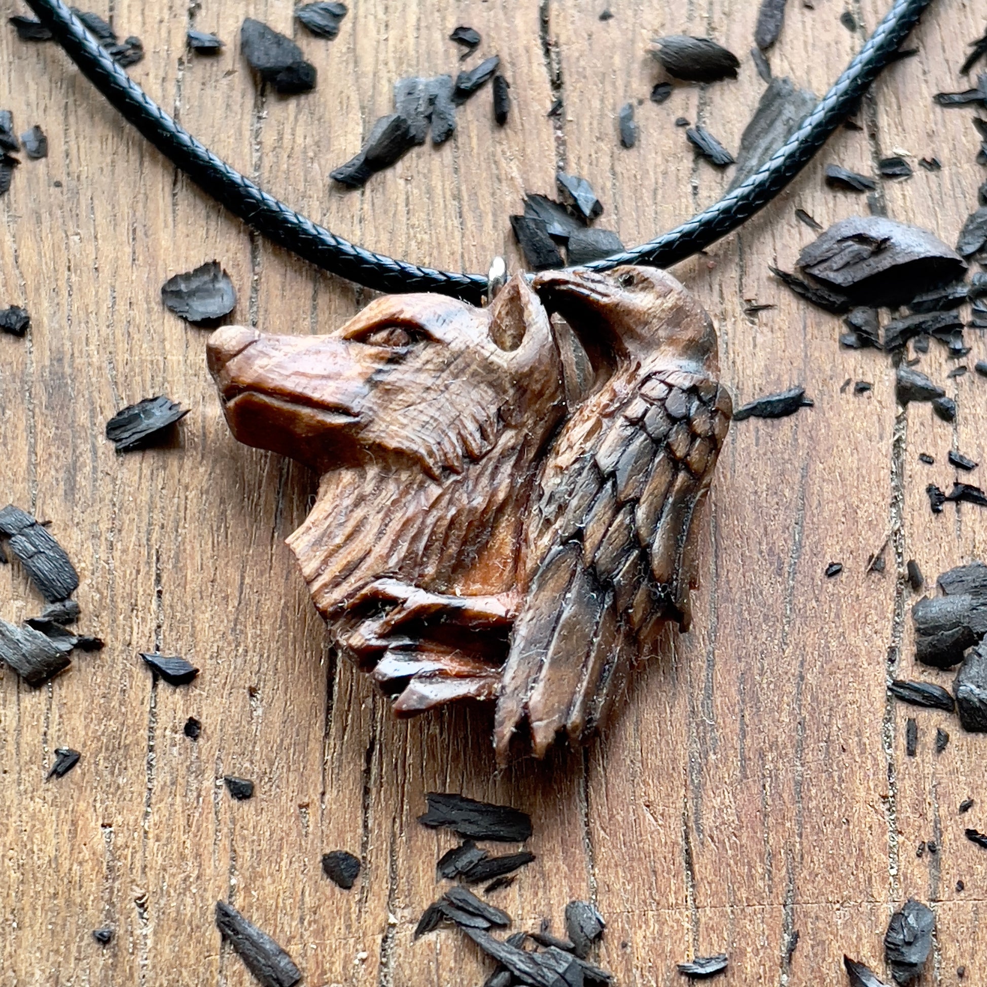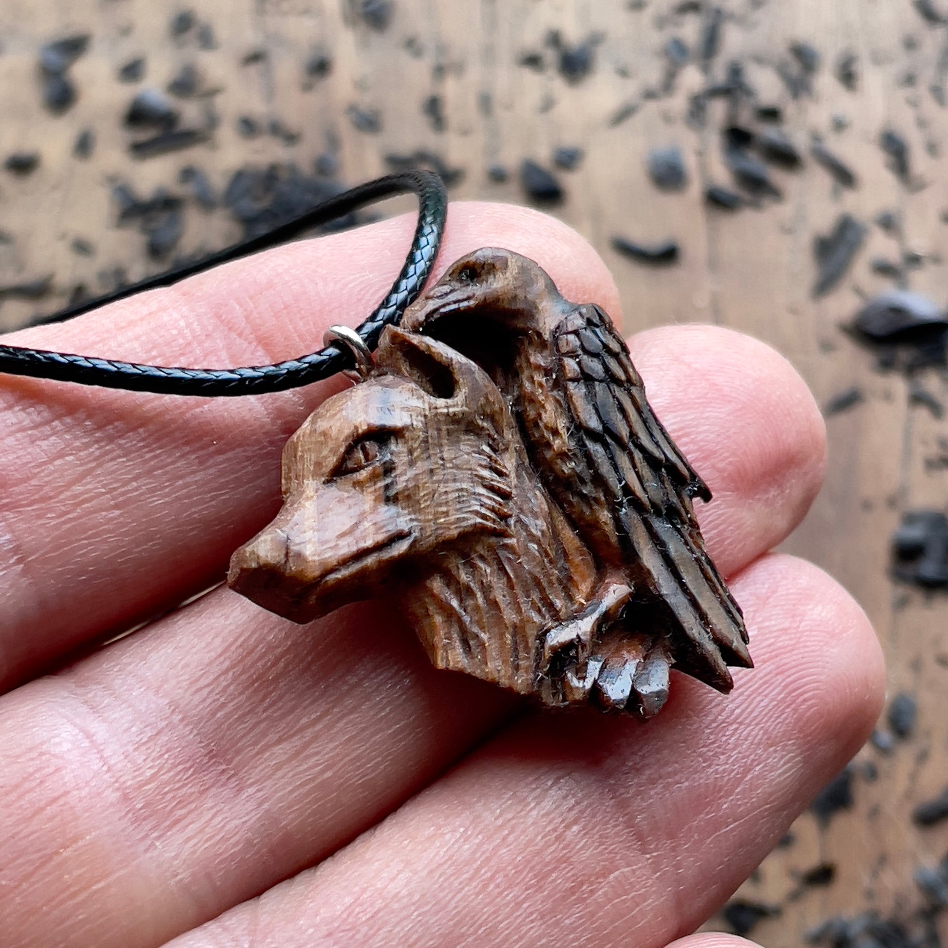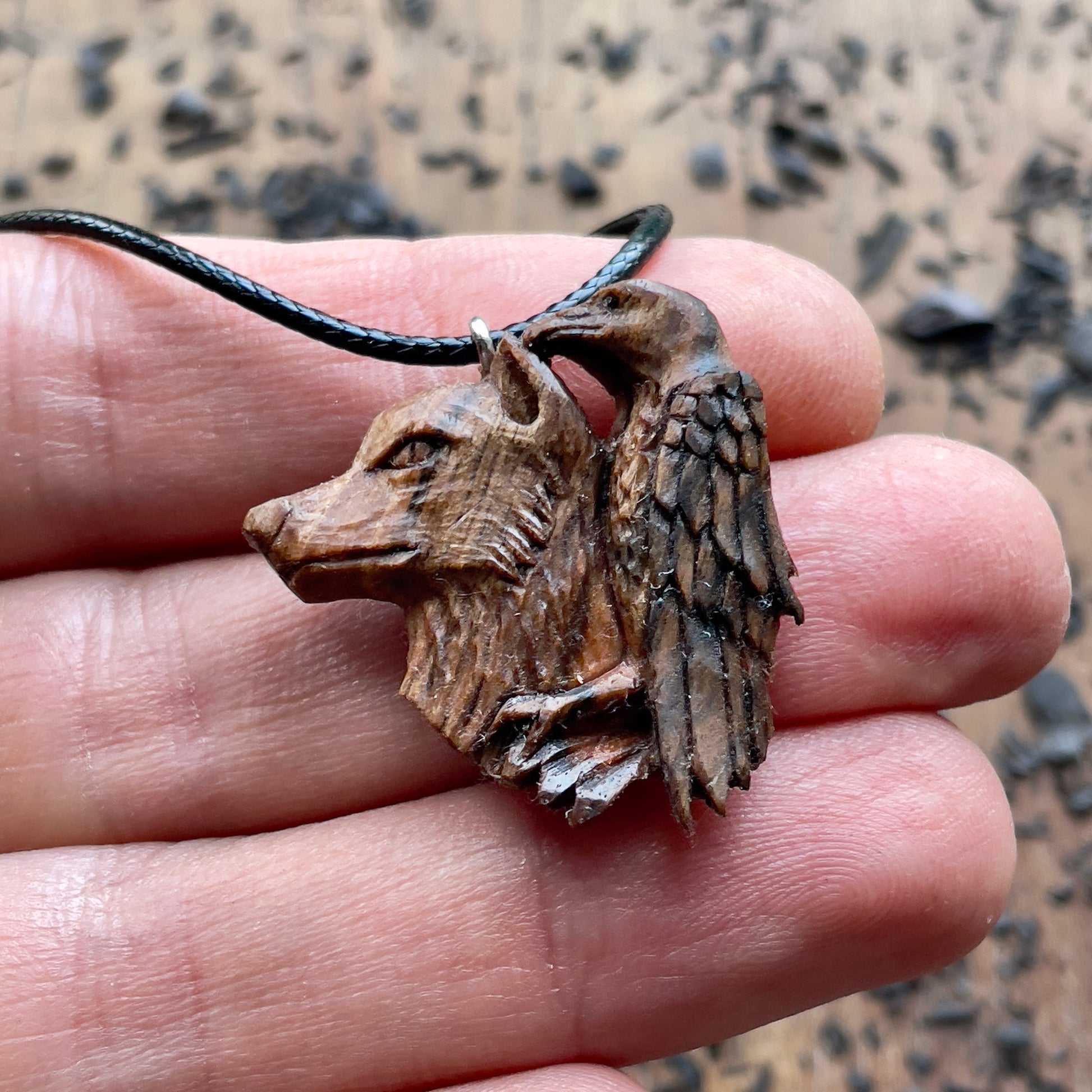 Questo splendido pendente a forma di lupo e corvo è intagliato a mano in legno di noce italiano. Tutti i dettagli della collana sono intagliati con coltello e sgorbie.