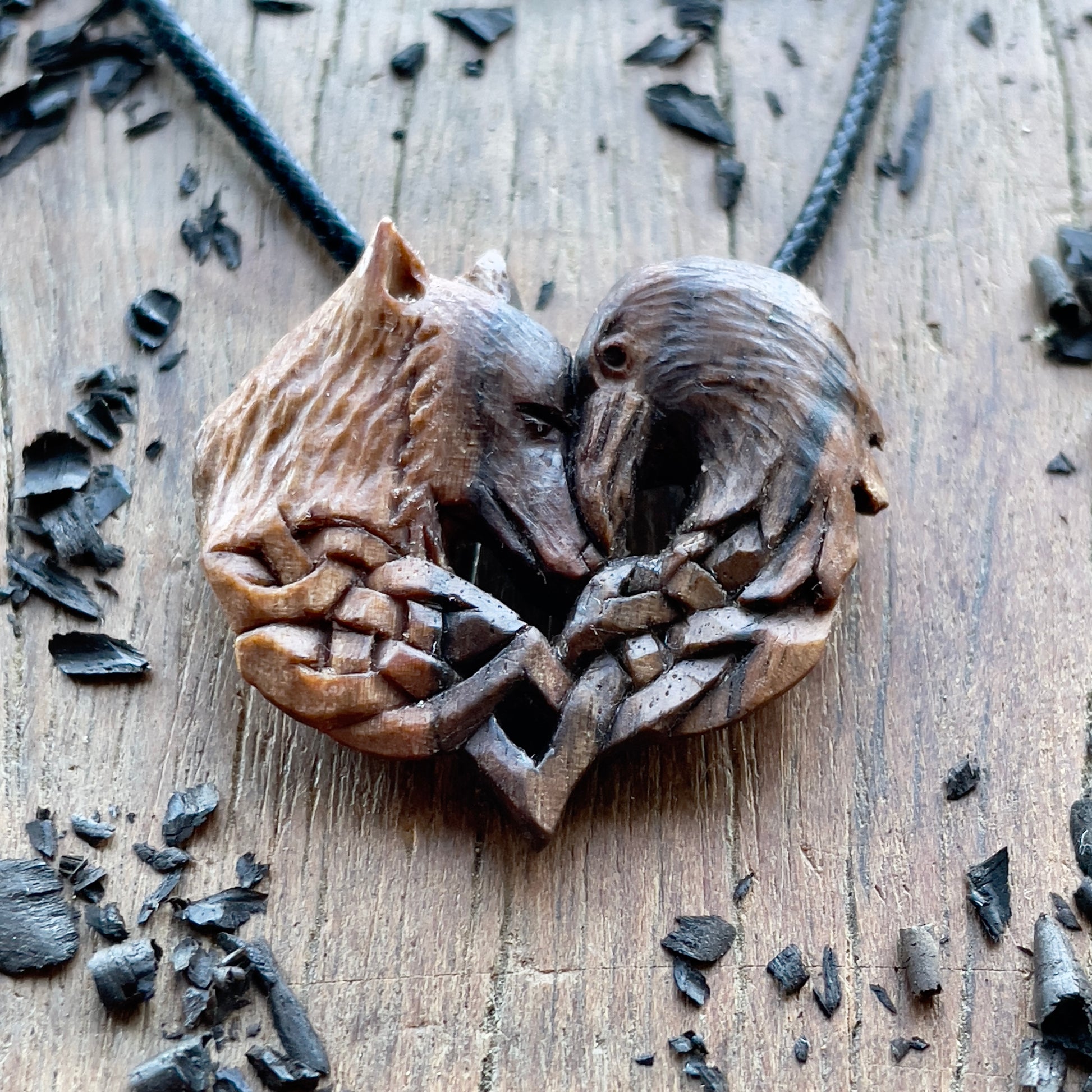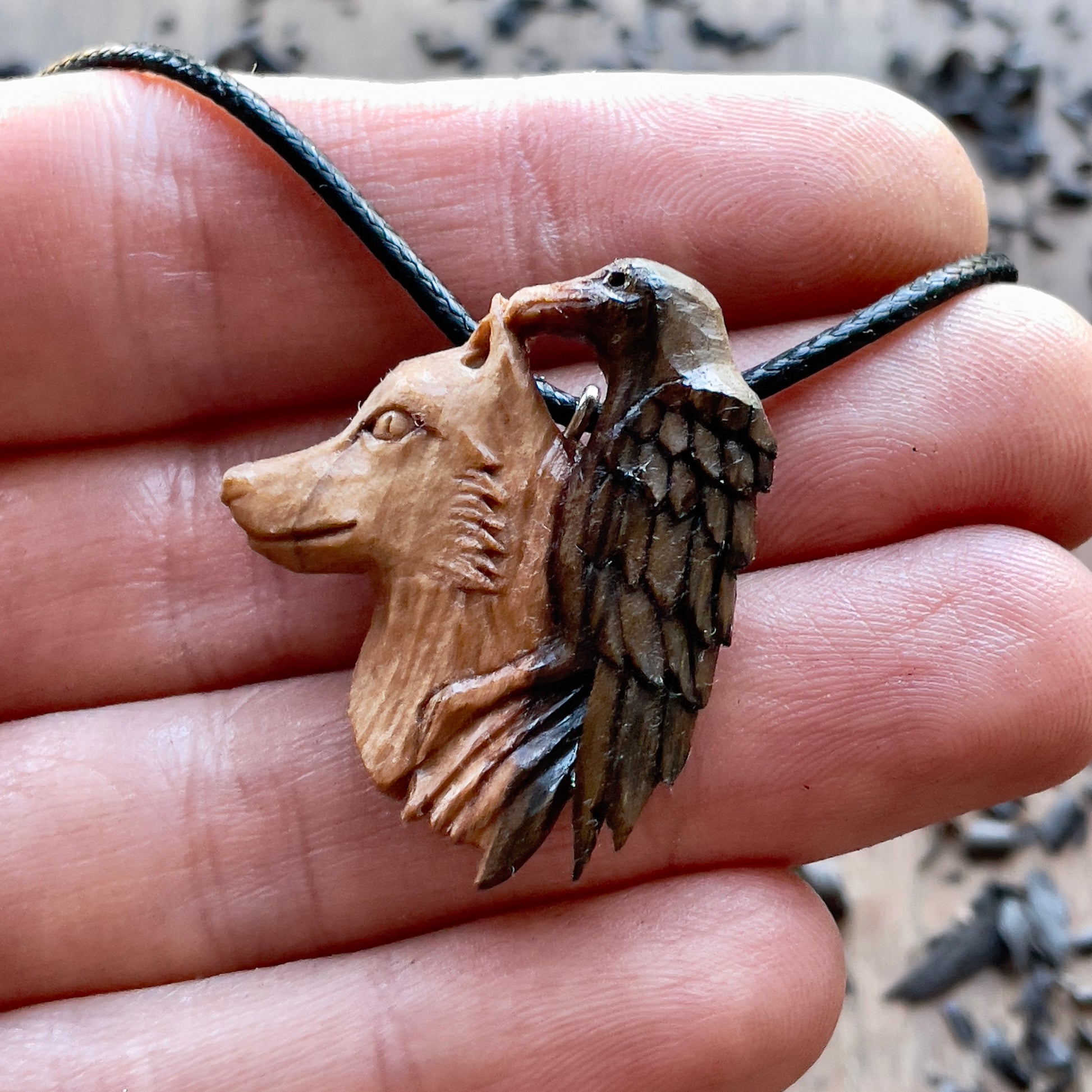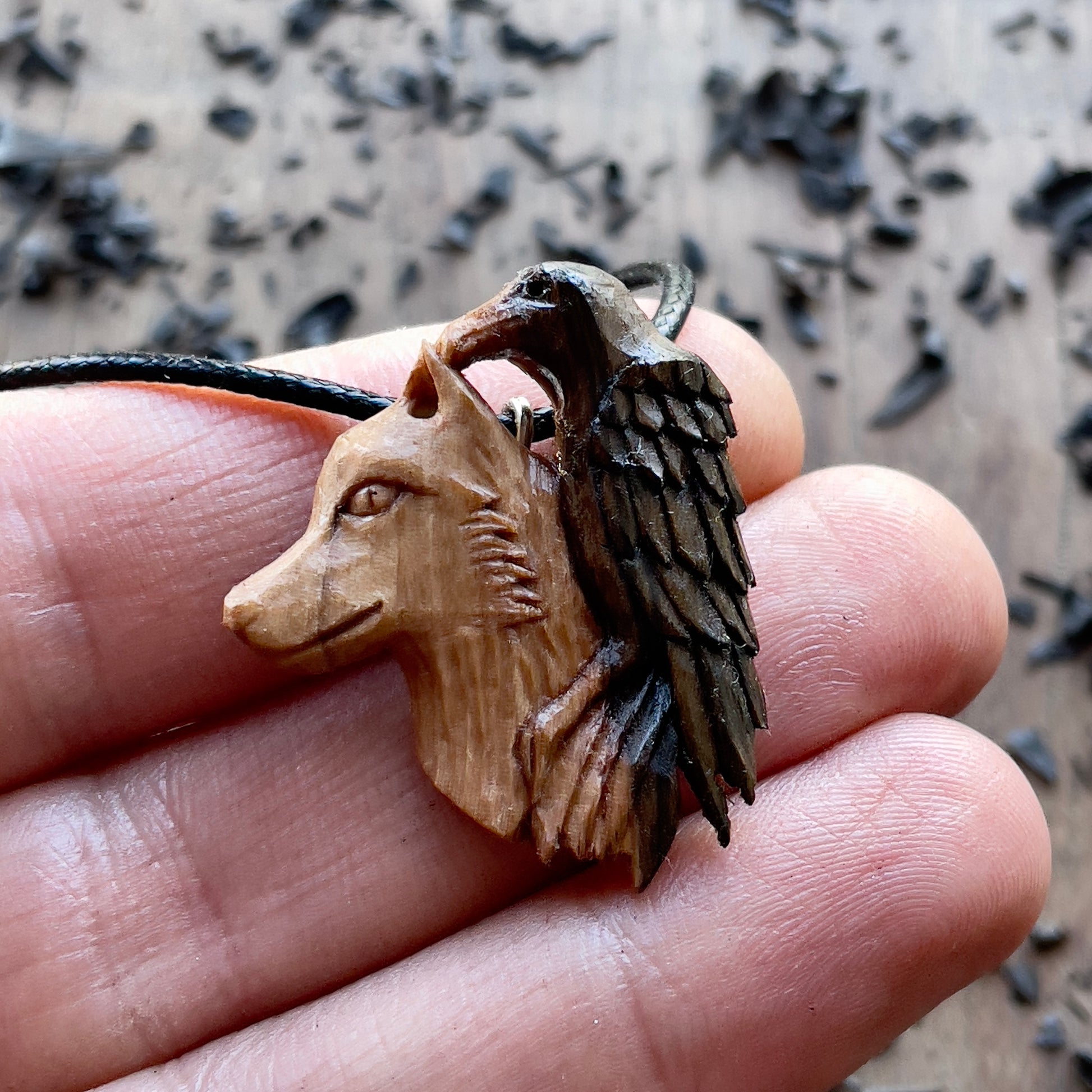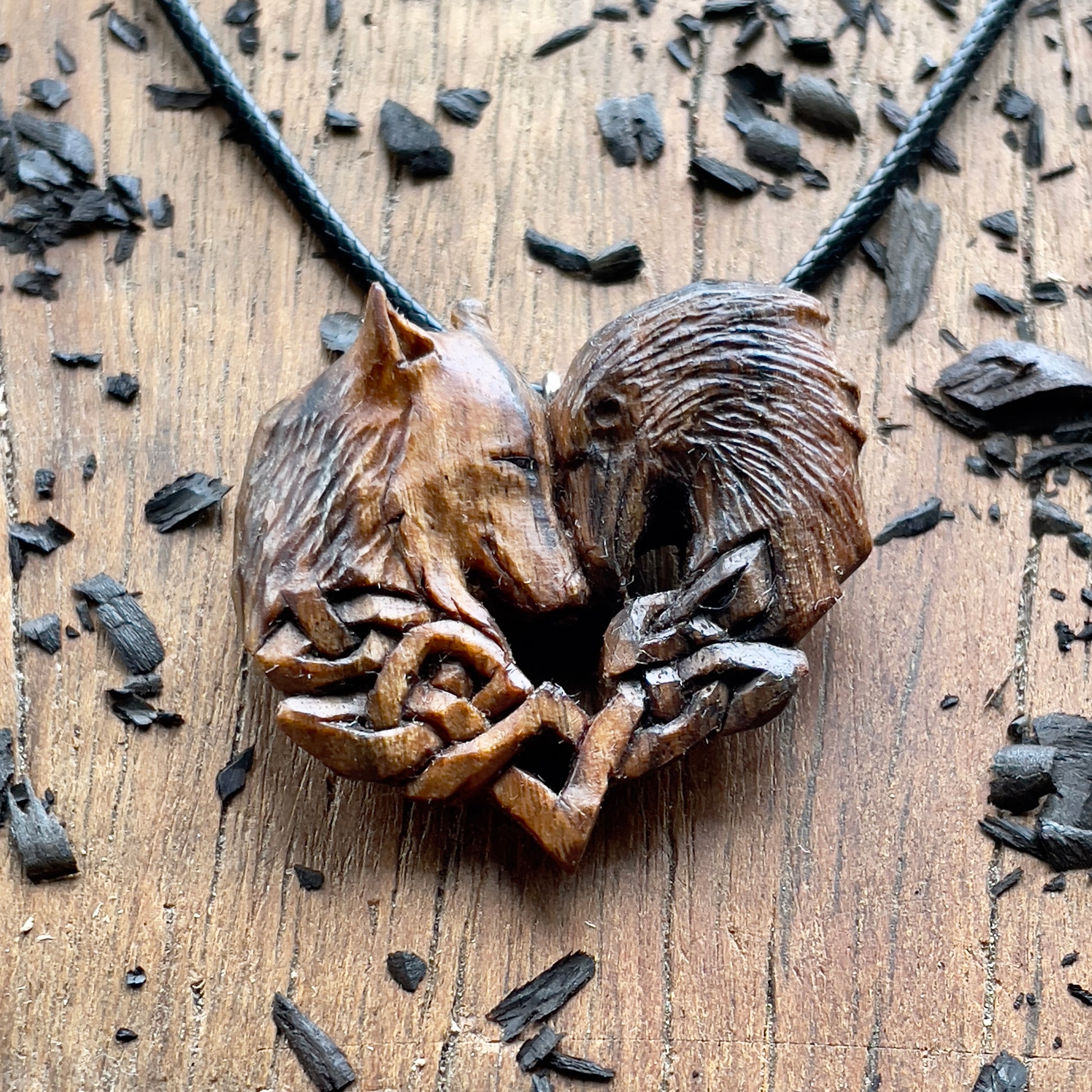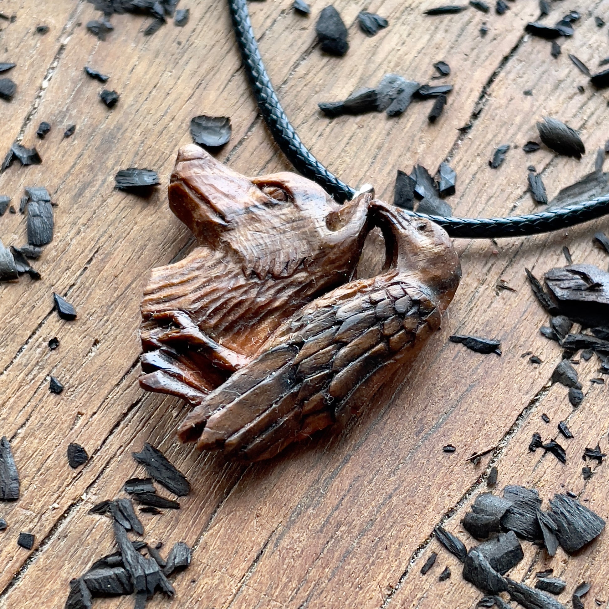 Questo splendido pendente a forma di lupo e corvo è intagliato a mano in legno di noce italiano. Tutti i dettagli della collana sono intagliati con coltello e sgorbie.