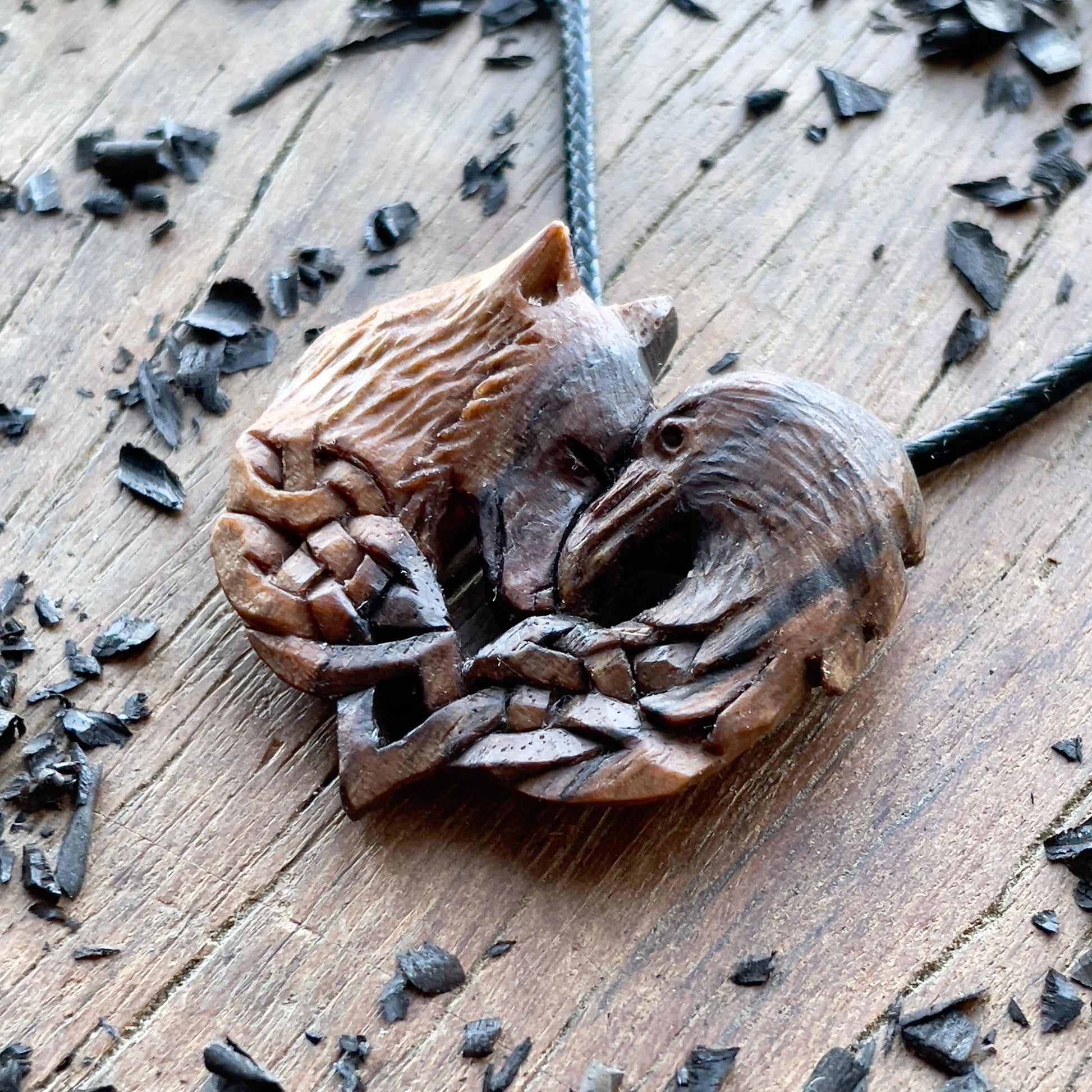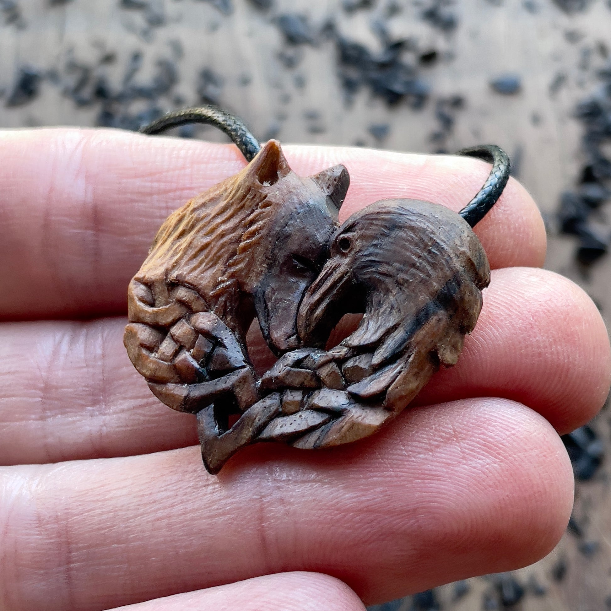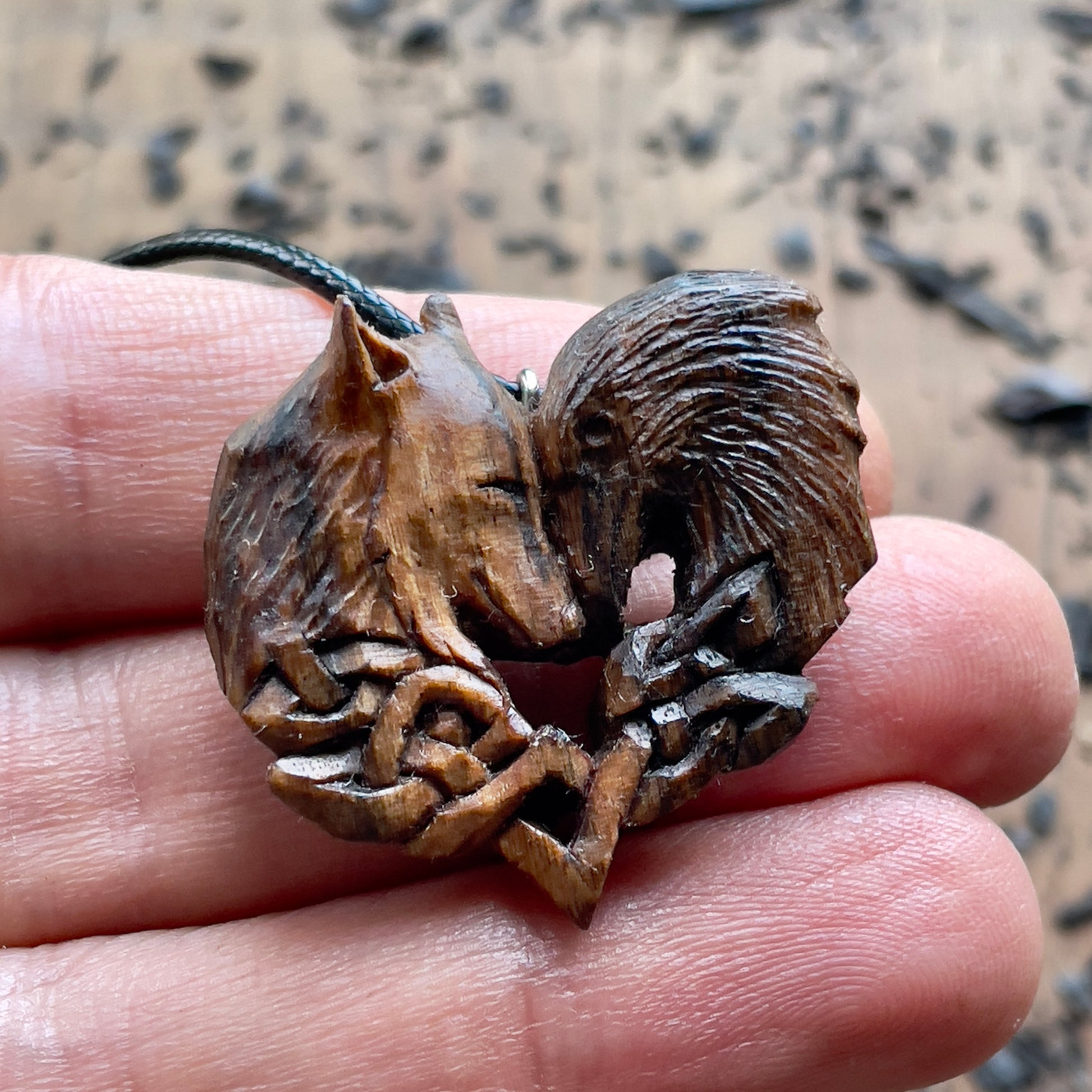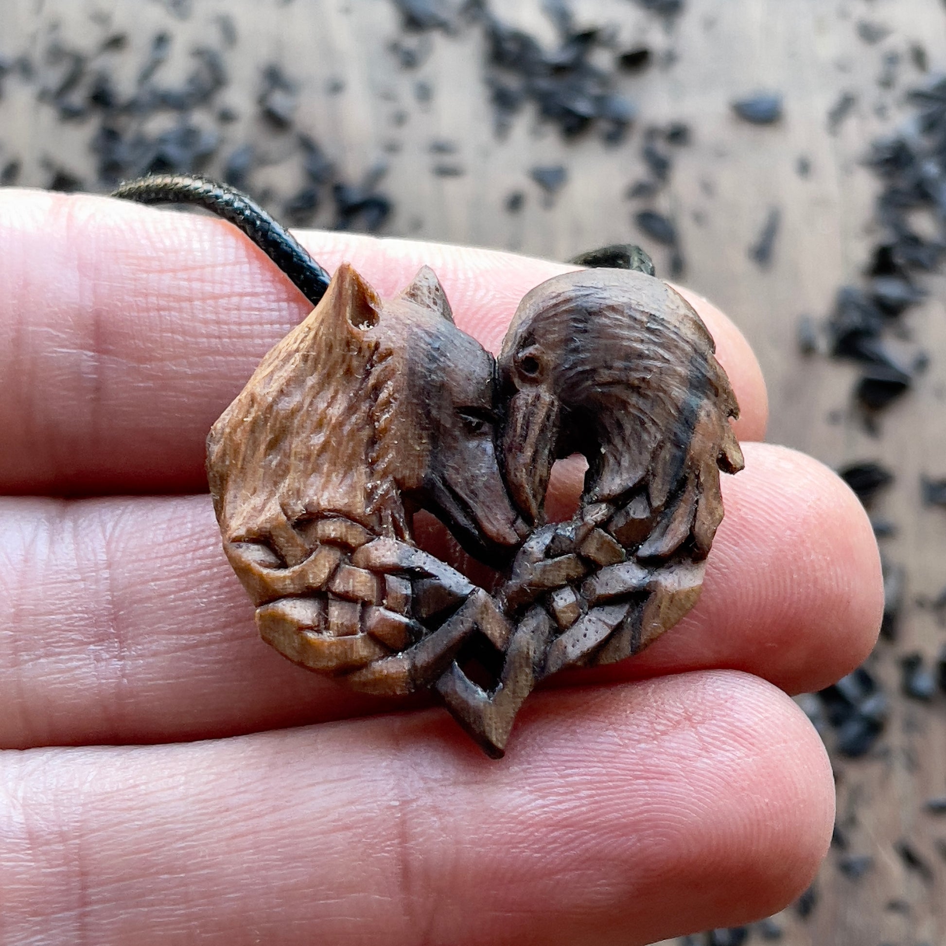Questo splendido pendente a forma di lupo e corvo è intagliato a mano in legno di noce italiano. Tutti i dettagli della collana sono intagliati con coltello e sgorbie.