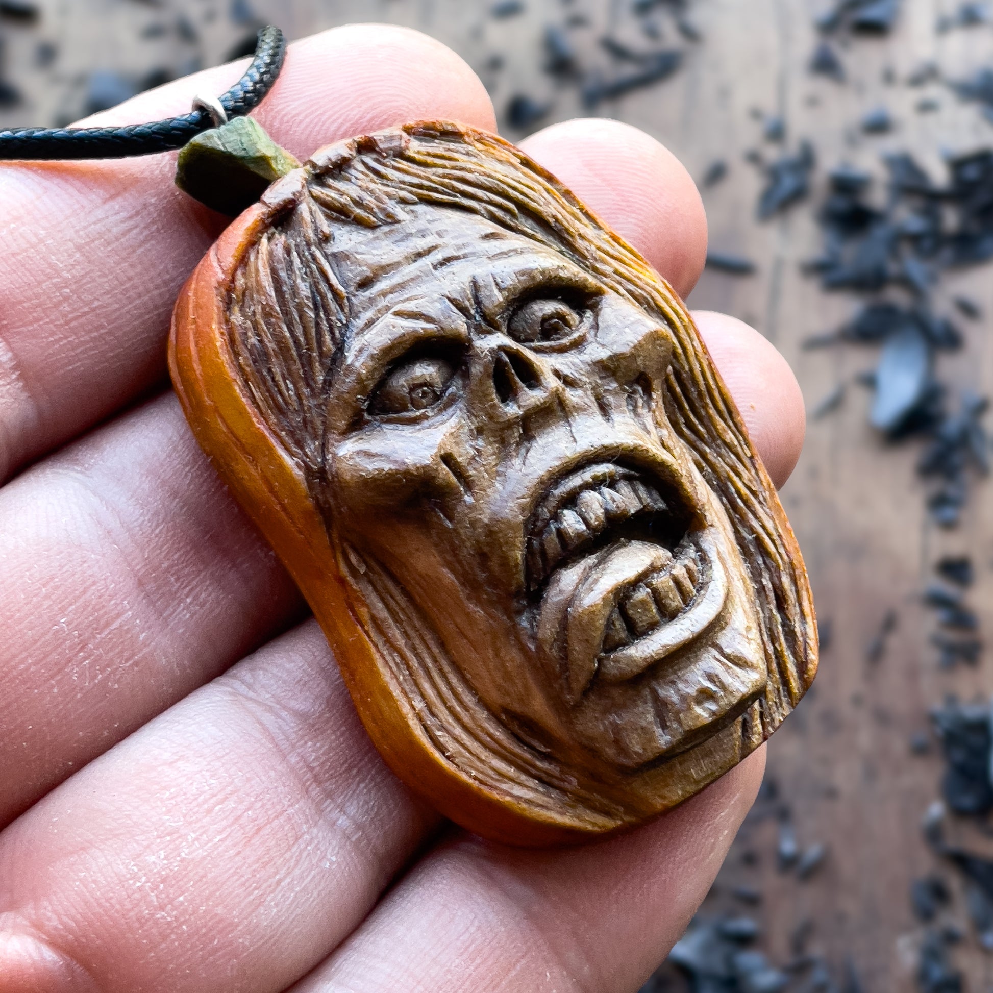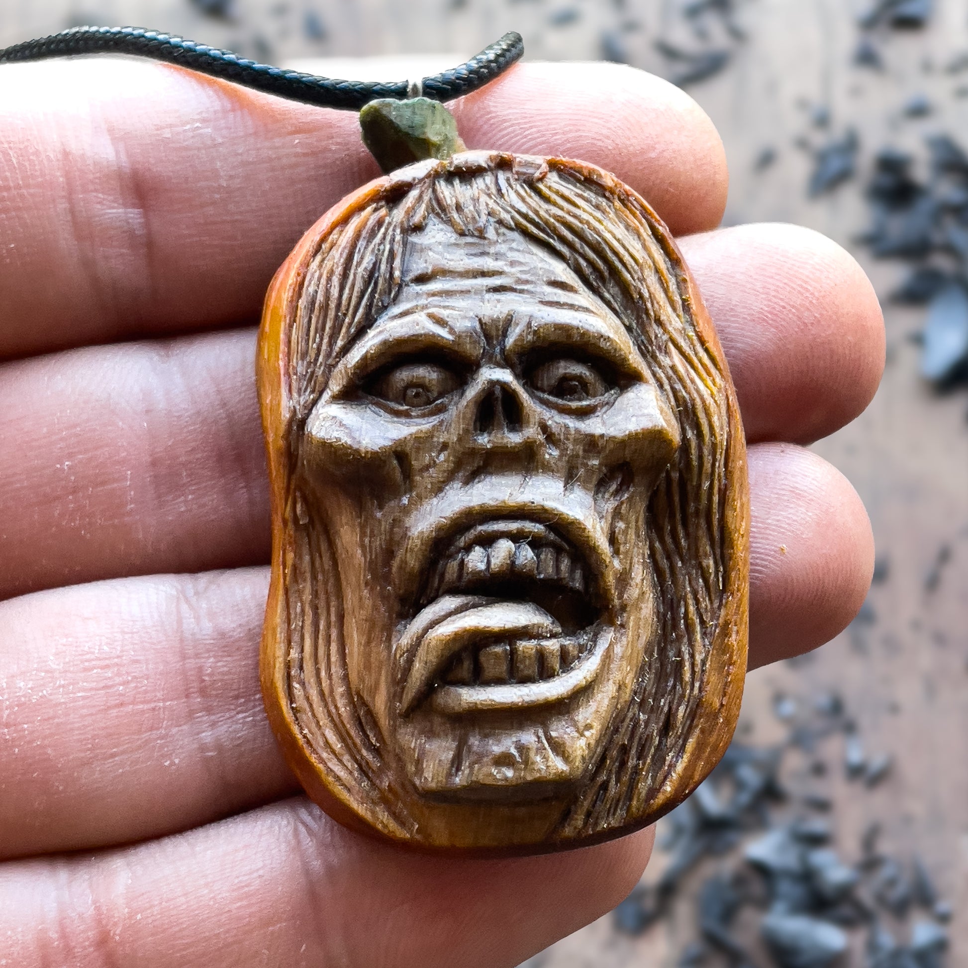 Questo volto di Zombie femminile con il design di un "pendente di zucca intagliato" è intagliato a mano in legno di noce italiano. Tutti i dettagli della collana sono intagliati con coltello e sgorbie.
