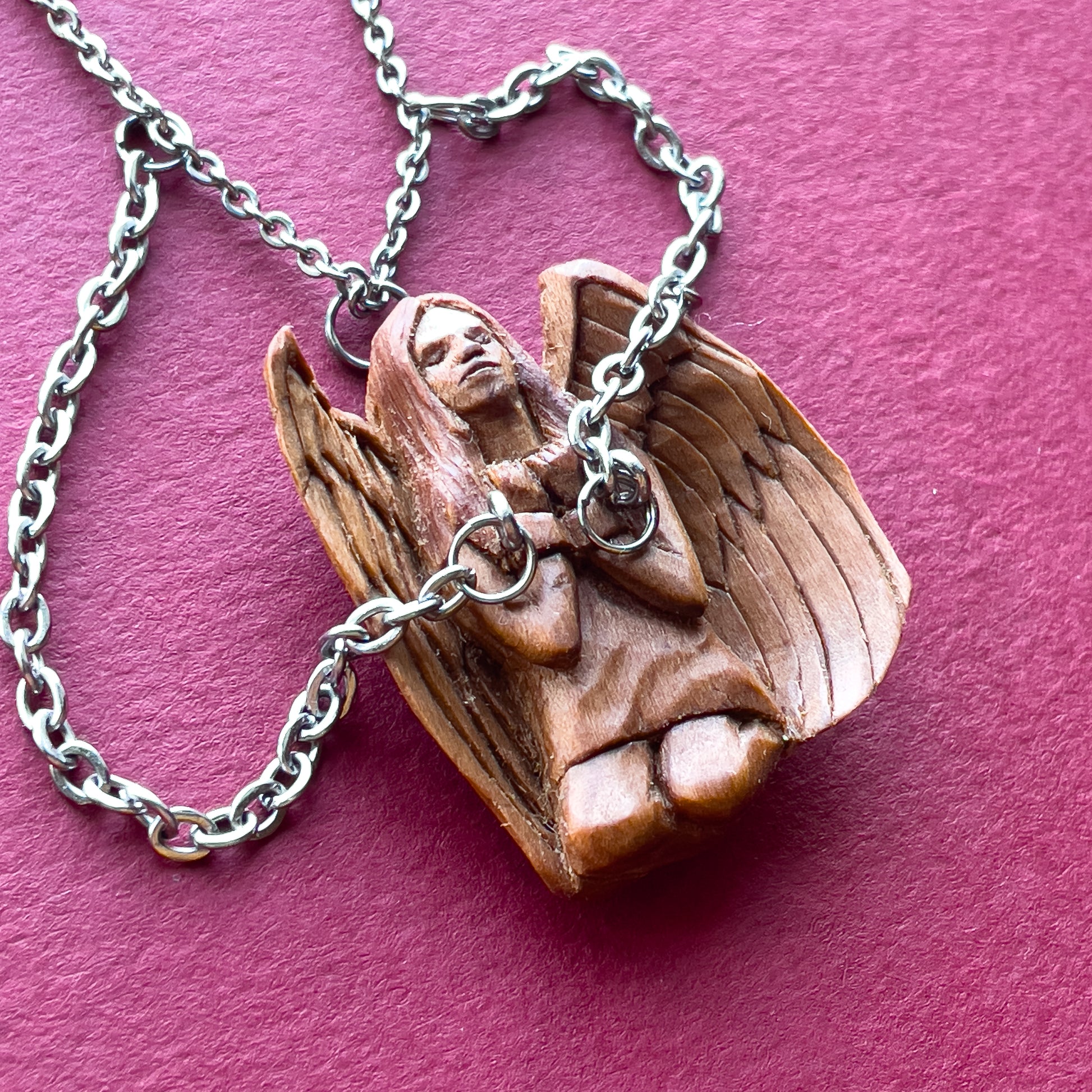Carved in cherry wood, this angel carries the warmth and softness of the material while holding a message of quiet defiance.