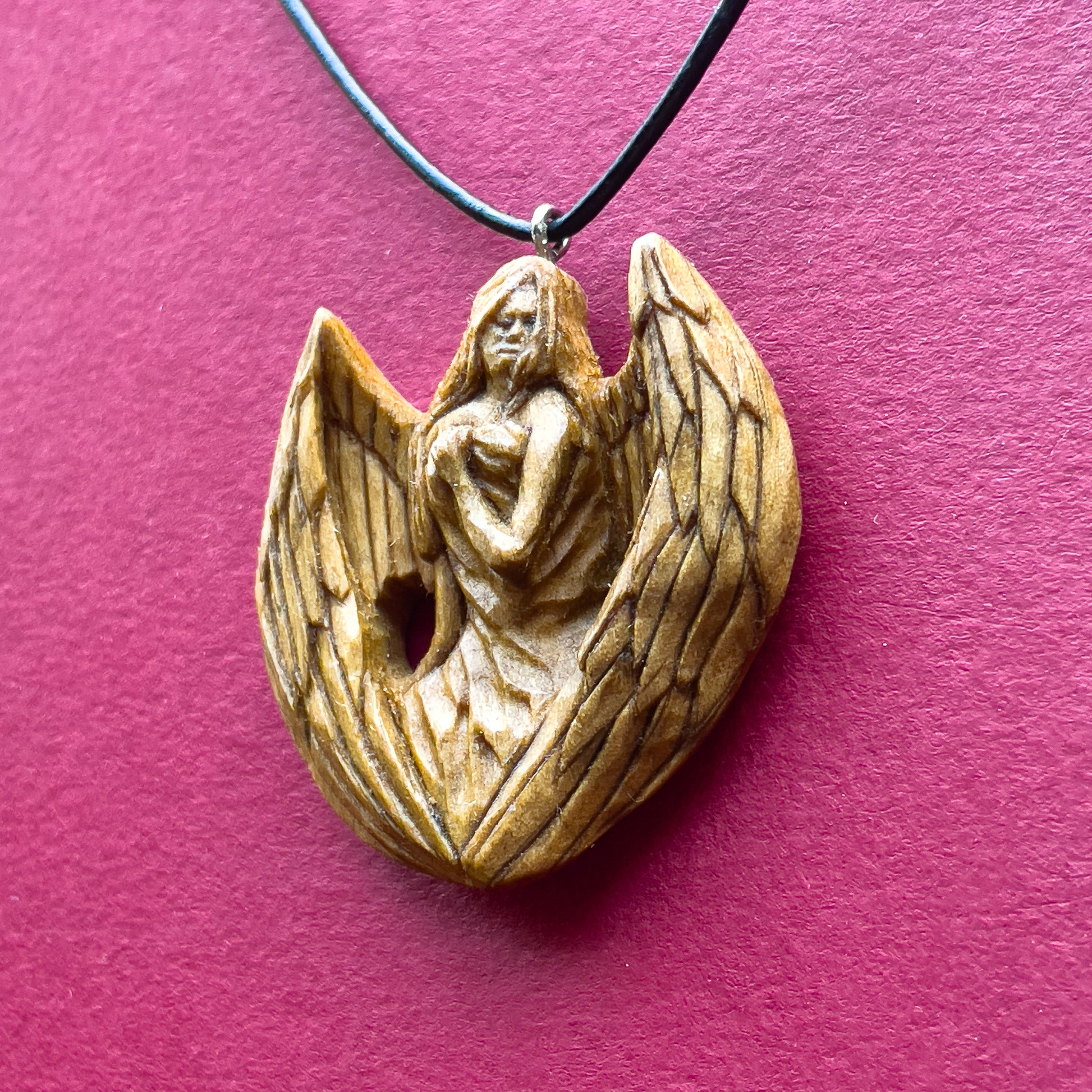 Carved from a light-toned piece of Italian walnut, this pendant radiates calm and quiet strength. Each fold of the cloth, each curve of the wings, was slowly formed by hand to bring out a story of gentle protection.