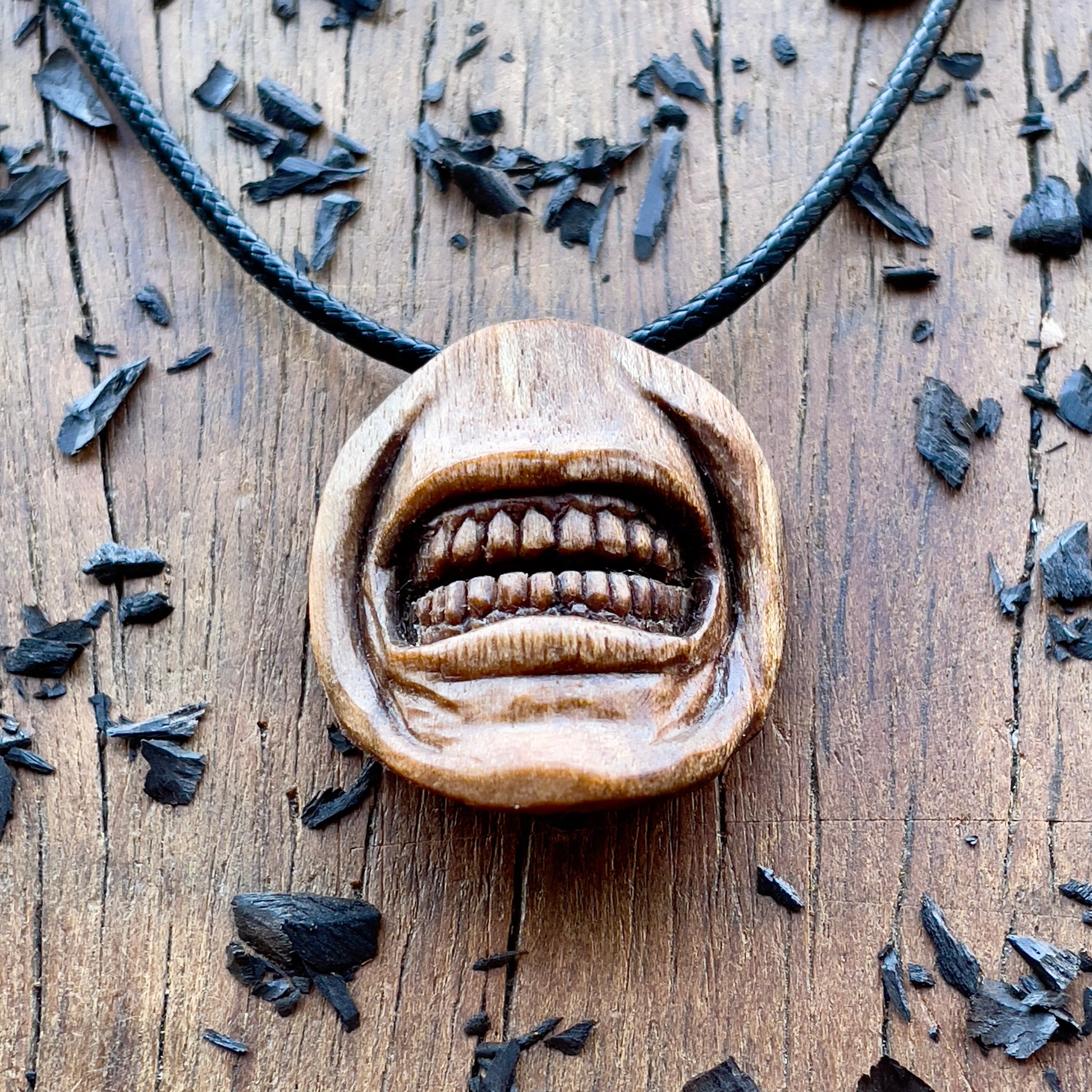 This Beautiful Angty Mouth pendant , is hand carved in Italian Walnut wood. All details of the necklace are carved by knife and gouges.