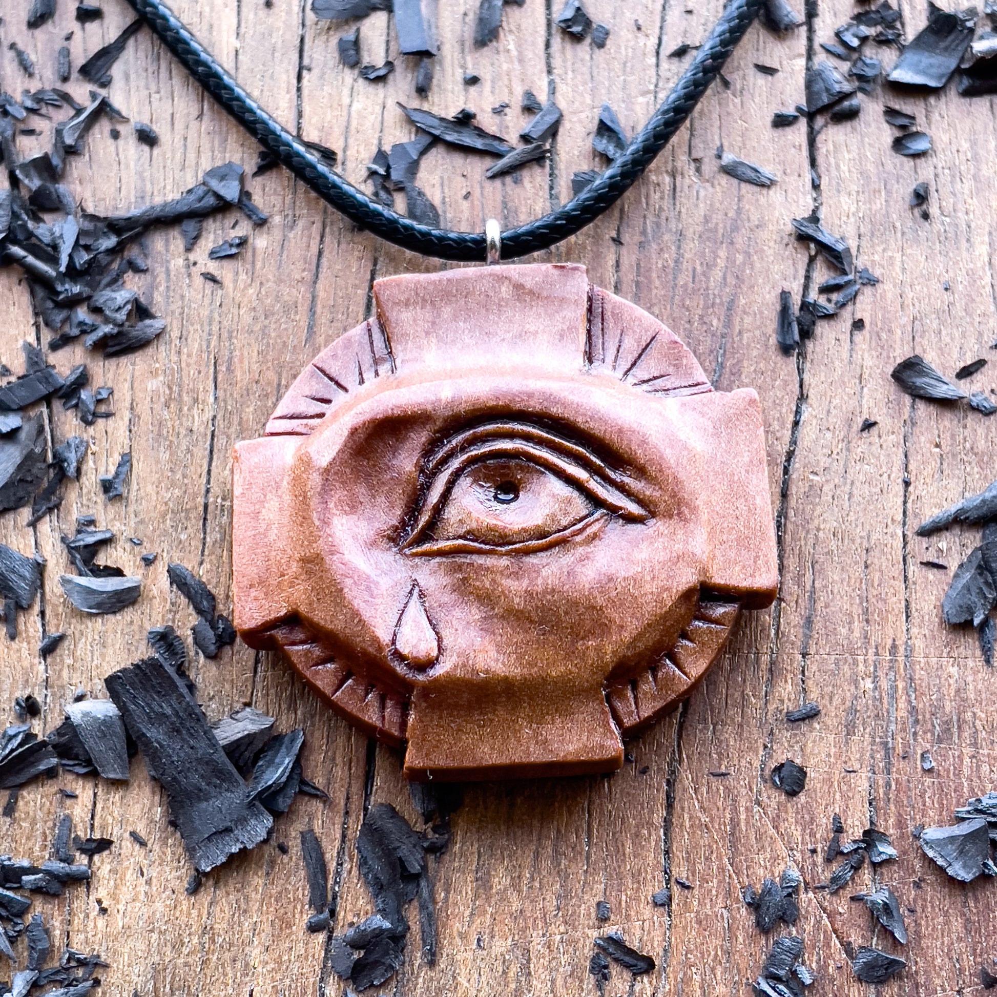 This Beautiful and unique eye on the cross pendant , is hand carved in pear wood. All details of the necklace are carved by knife and gouges.