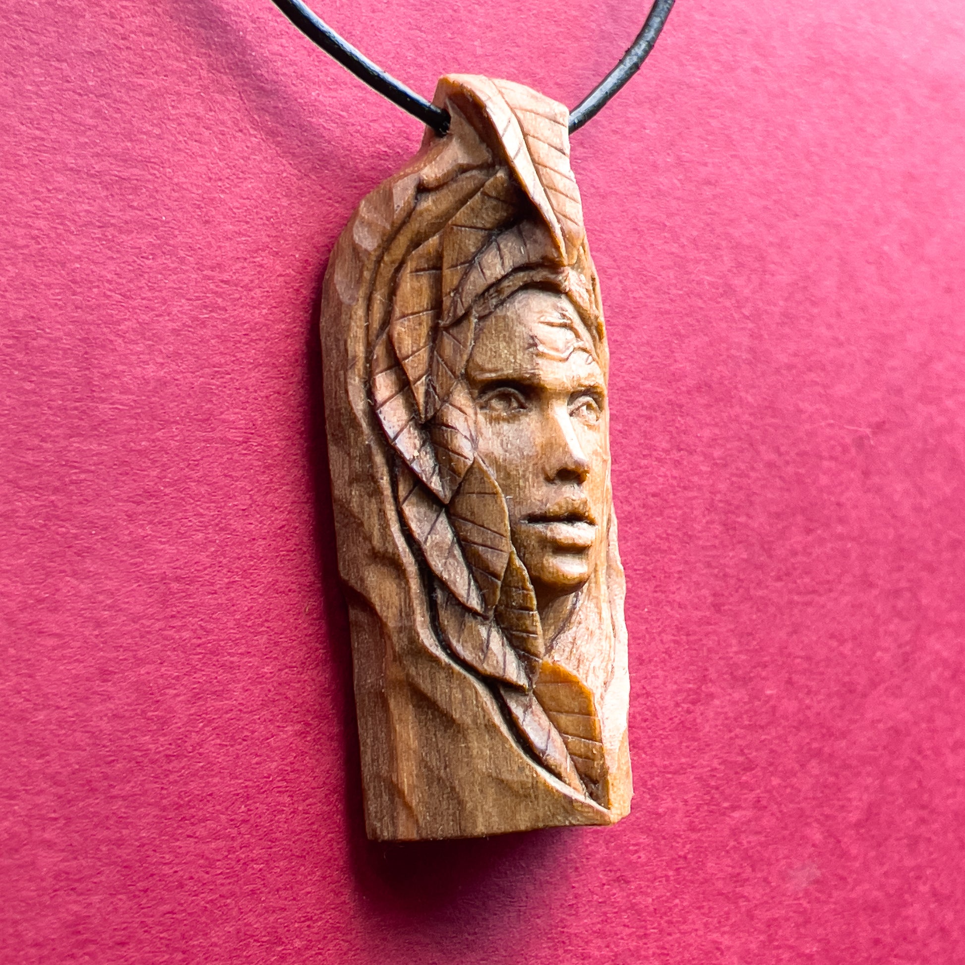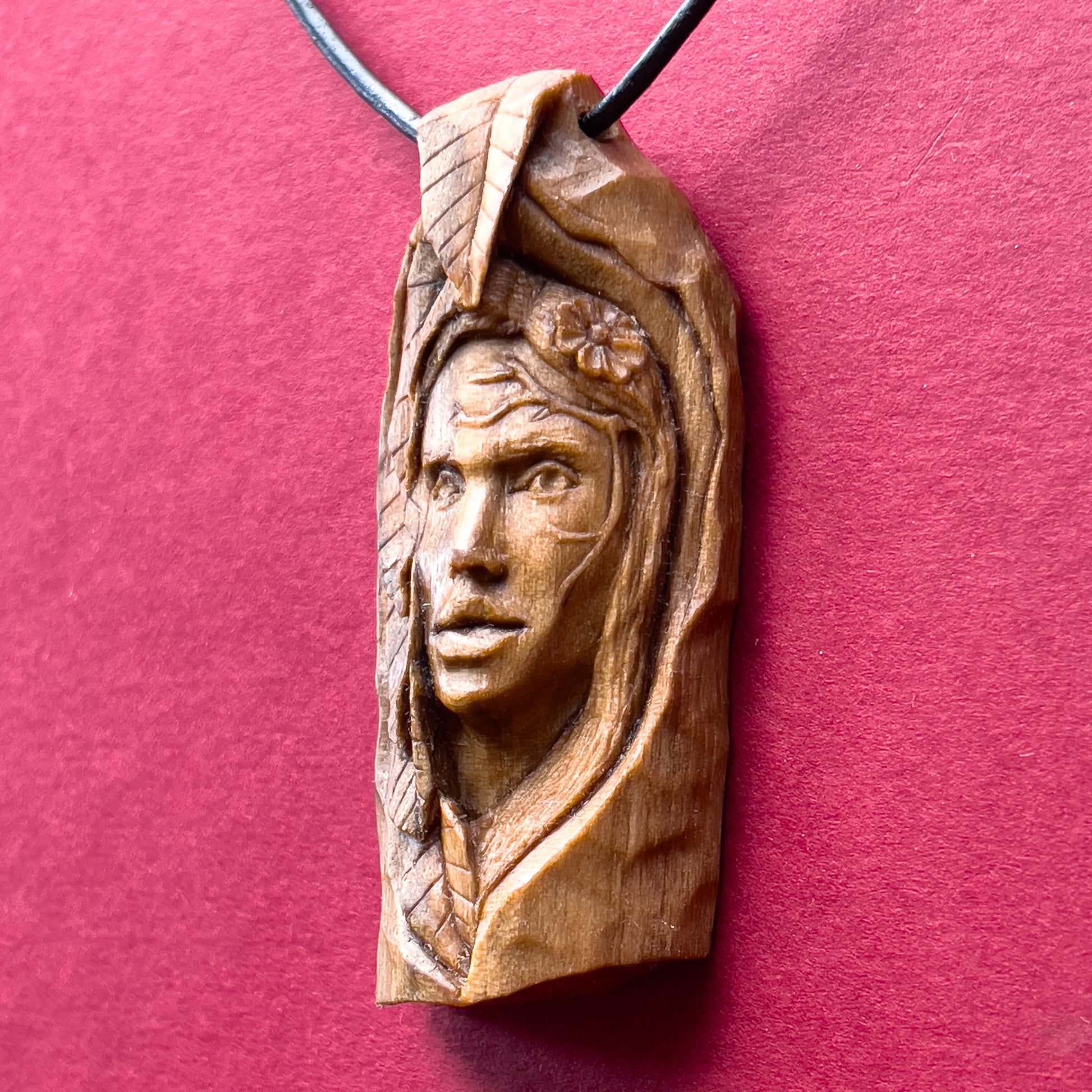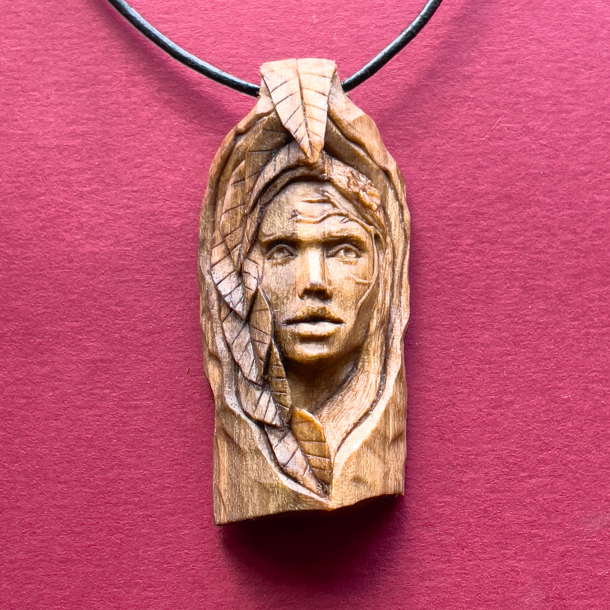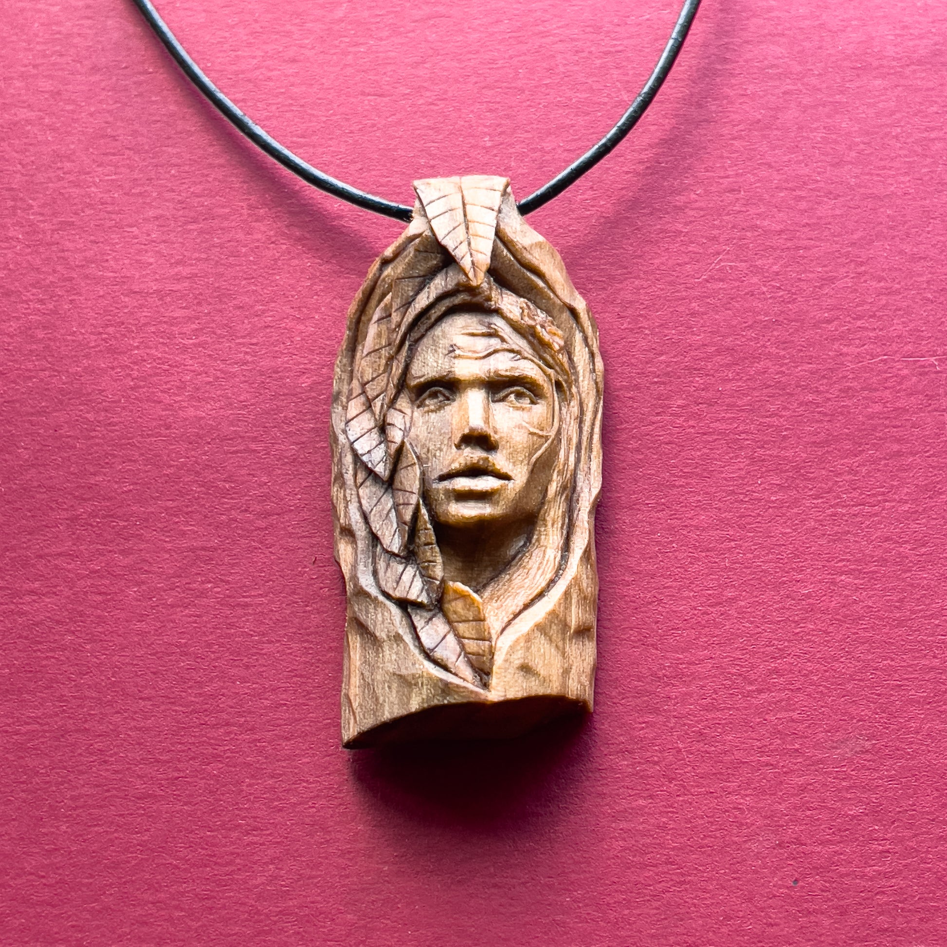 Hand-carved from Italian walnut wood, this piece carries a sacred calm. The pendant was originally made years ago, but as the artist grew, so did the vision. In this restoration, new details emerged, subtle textures, delicate lines, small branches on her cheek — all carved to echo the strength in gentleness.