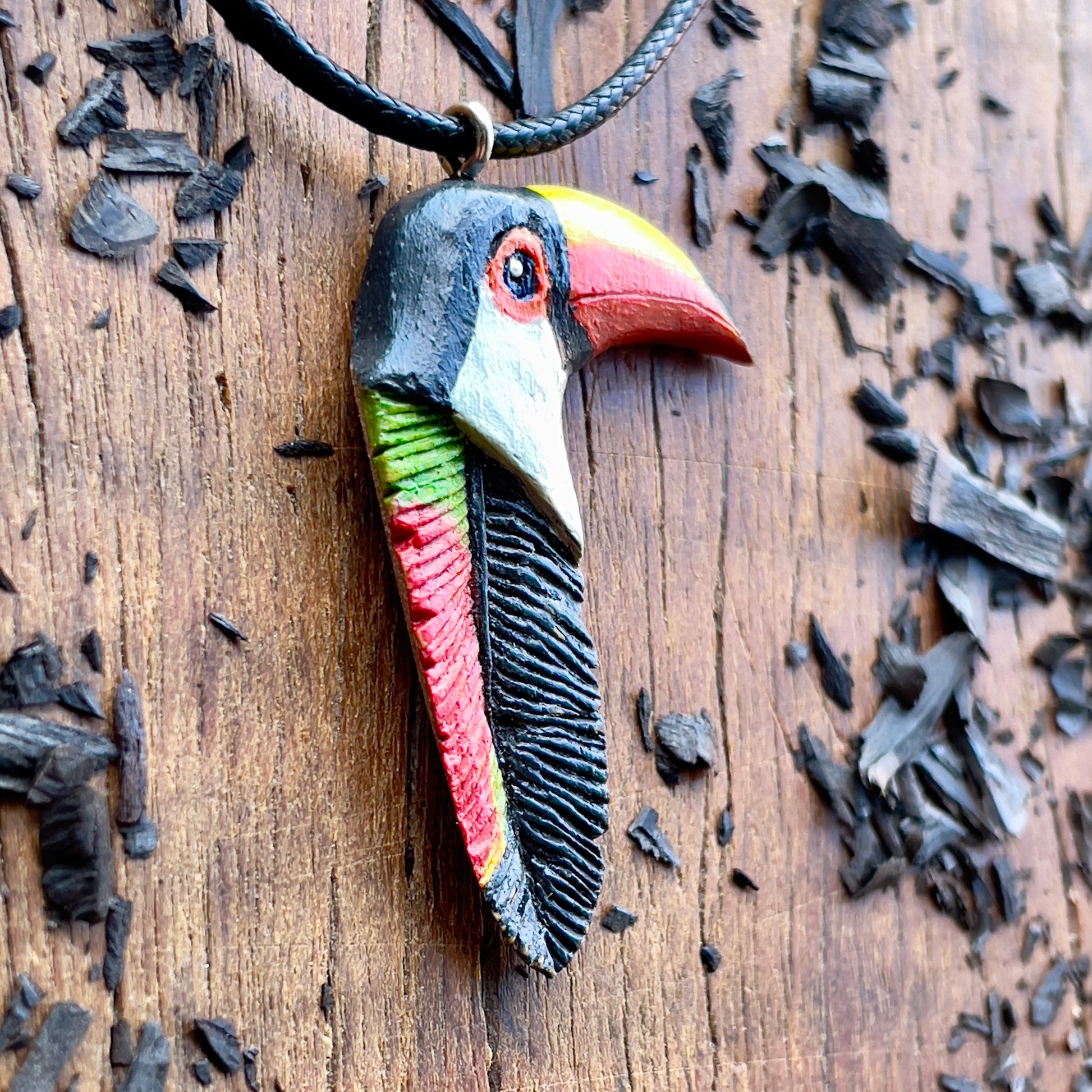 This beautiful Toucan pendant, is hand carved in Italian walnut wood, and finished with acrylics to personalize realistic colors of this fish. All details of the necklace are carved by knife and gouges.