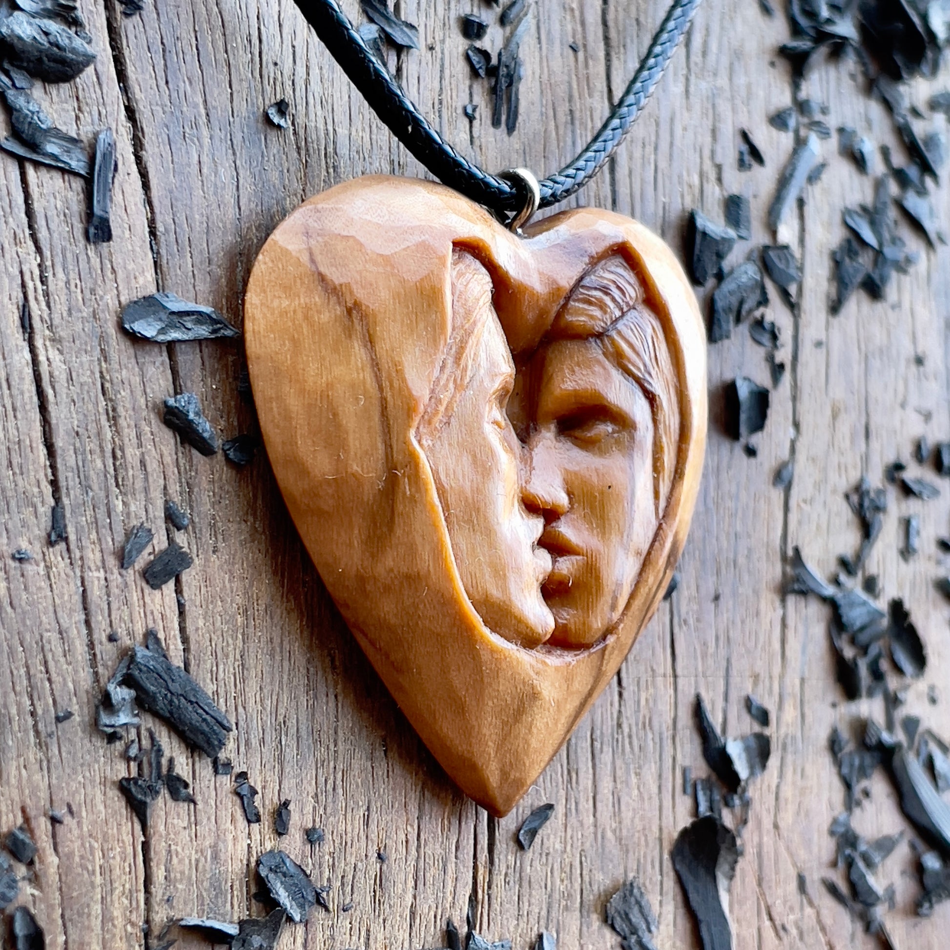 This beautiful and unique kiss “into heart” pendant, is hand carved in olive wood. All details of the necklace are carved by knife and gouges.