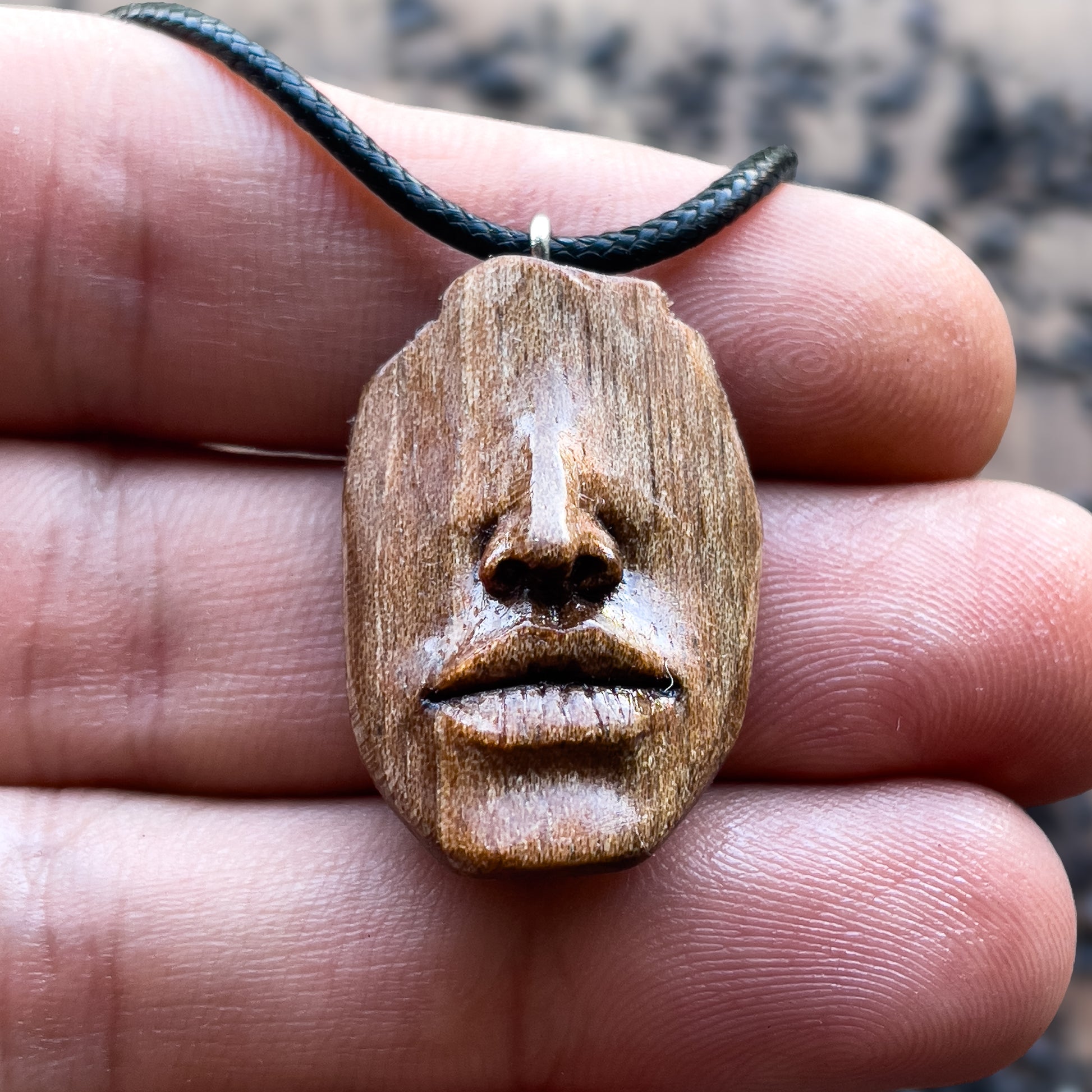 This Beautiful Nose and Mouth pendant , is hand carved in dark Walnut wood. All details of the necklace are carved by knife and gouges.