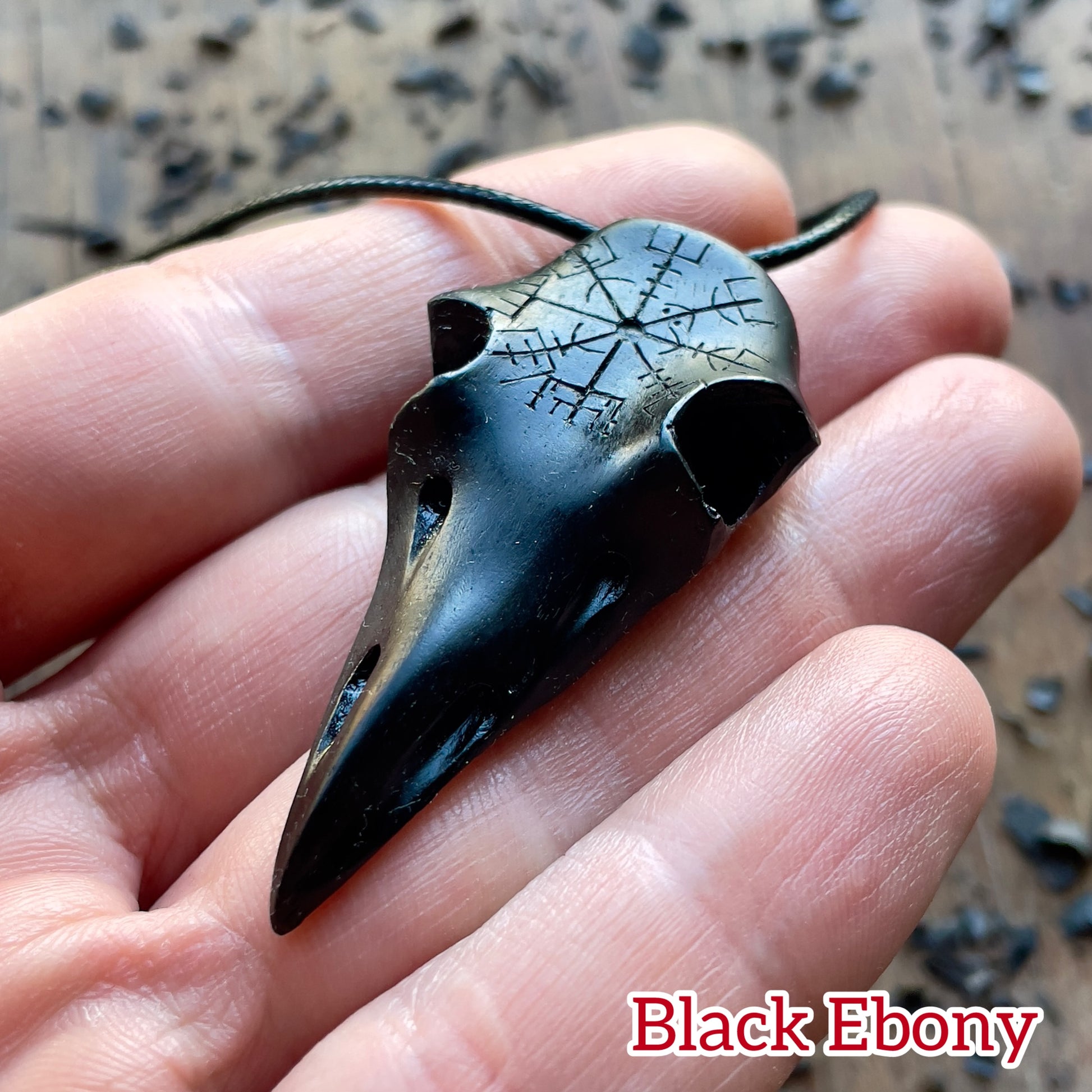 • Symbolic Design – Raven skull carved with the Vegvísir, a powerful Norse compass symbol
