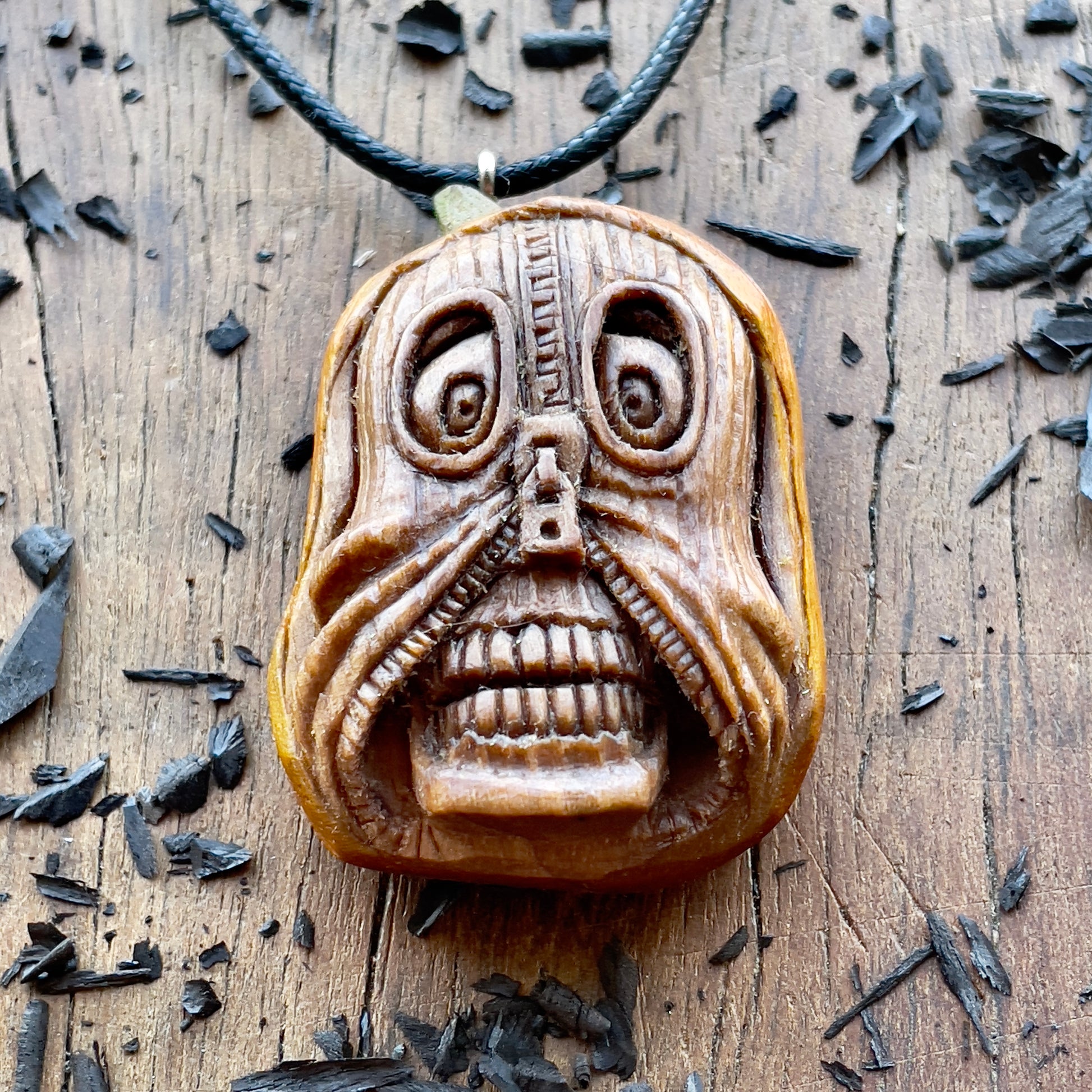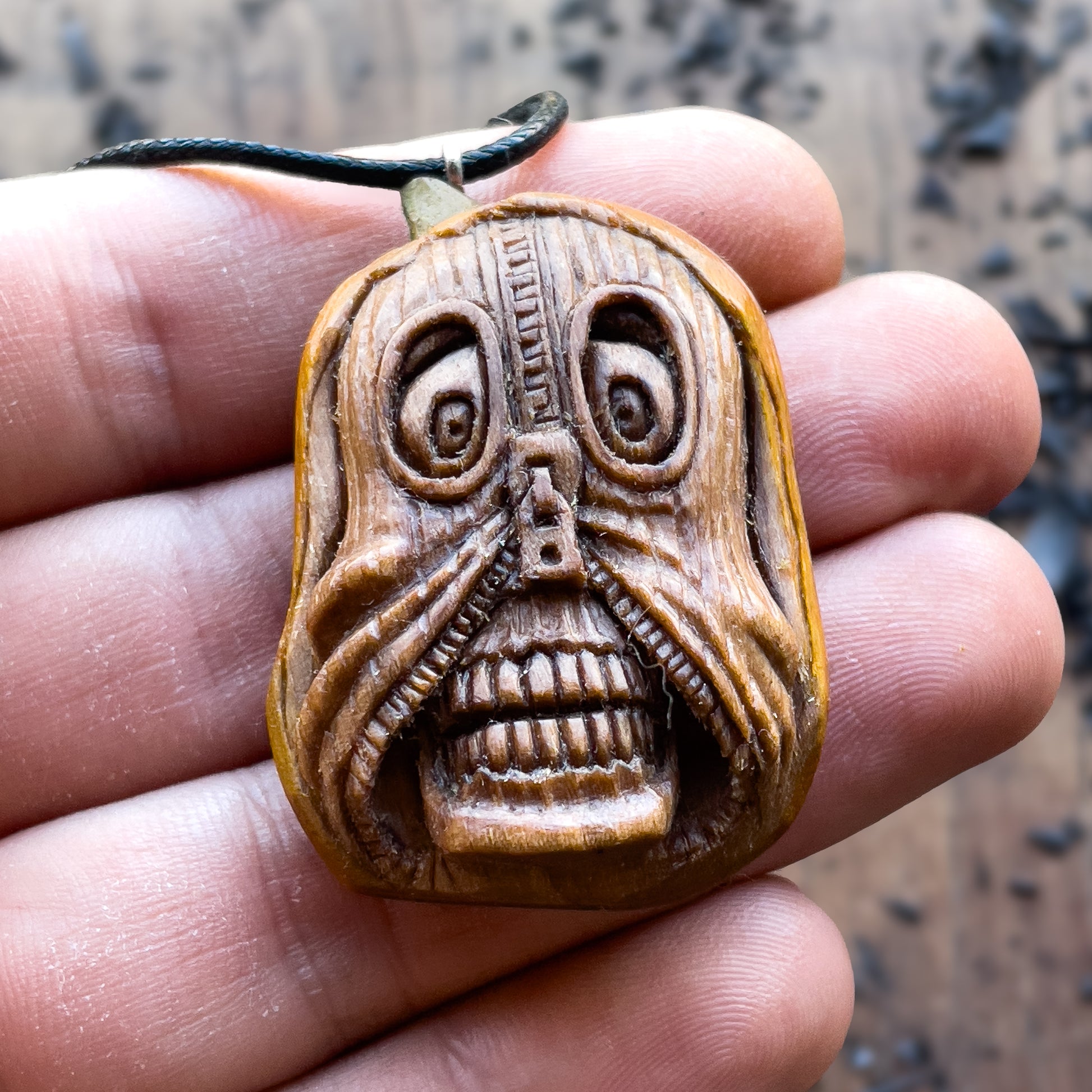Hand-carved from Italian walnut wood and finished with acrylics and oils, it blends fine craftsmanship with gothic imagination. Each pendant is unique, each veil hiding a different story.