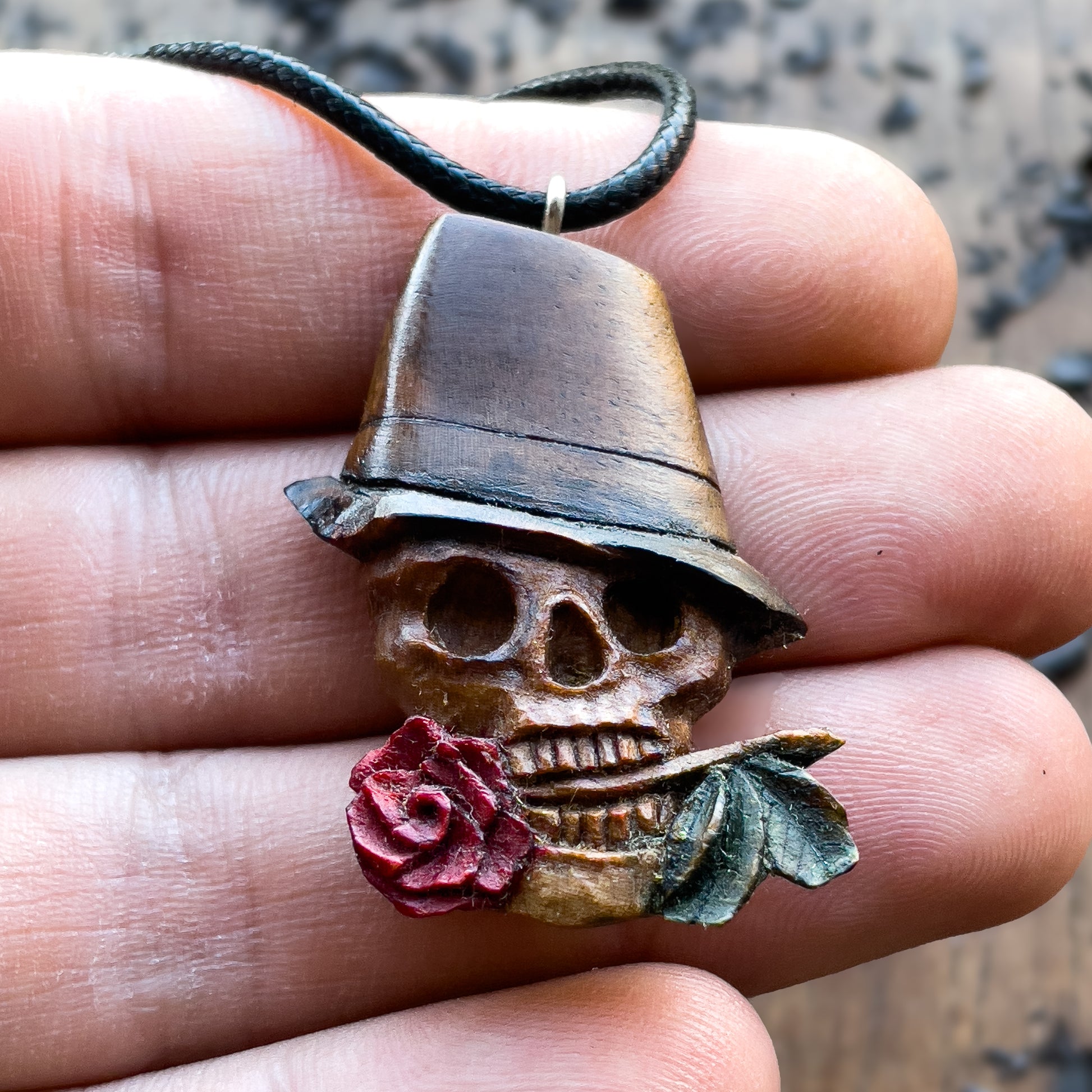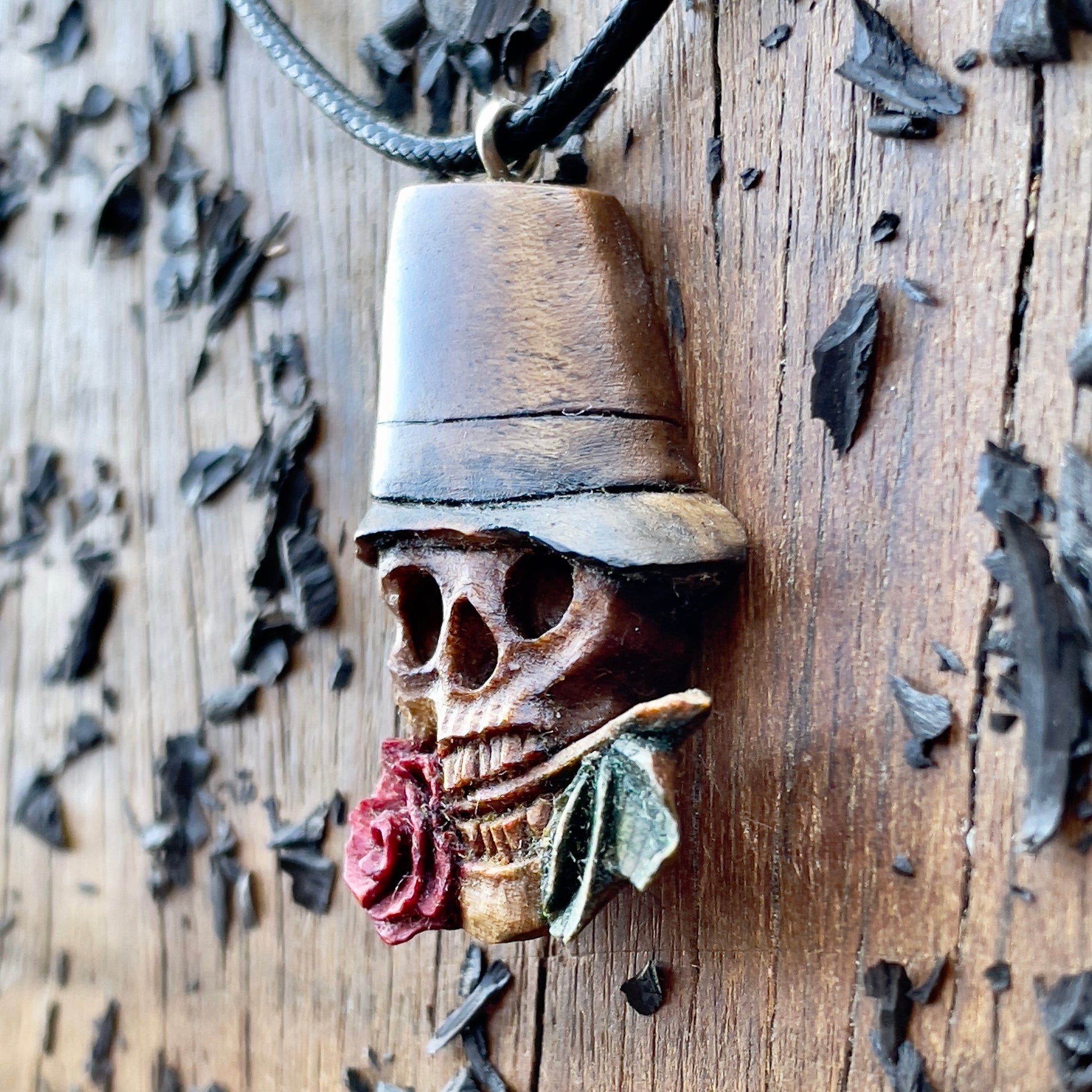 This Beautiful Skull with Rose Pendant is hand carved in Italian walnut wood. All details of the necklace are carved by knife and gouges.