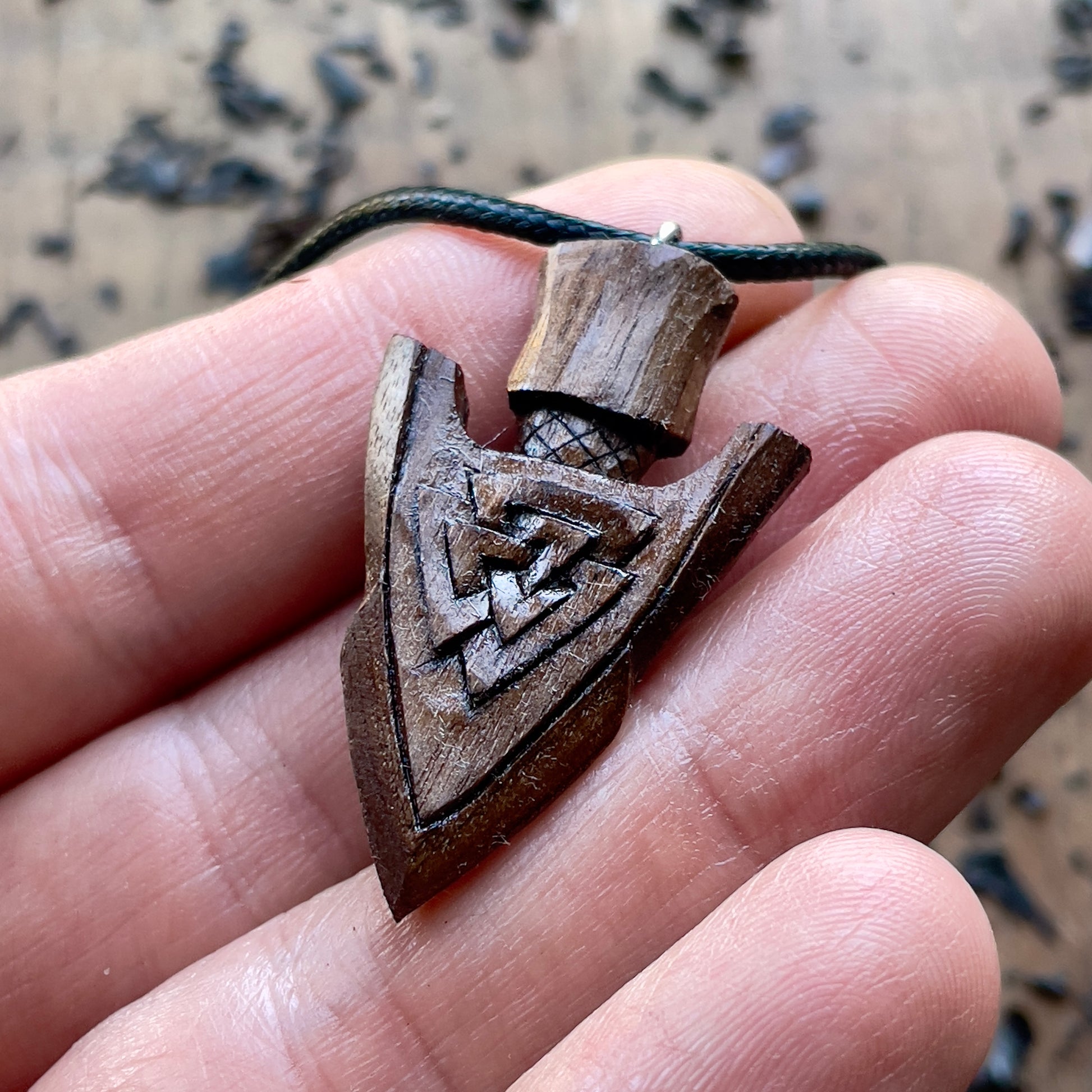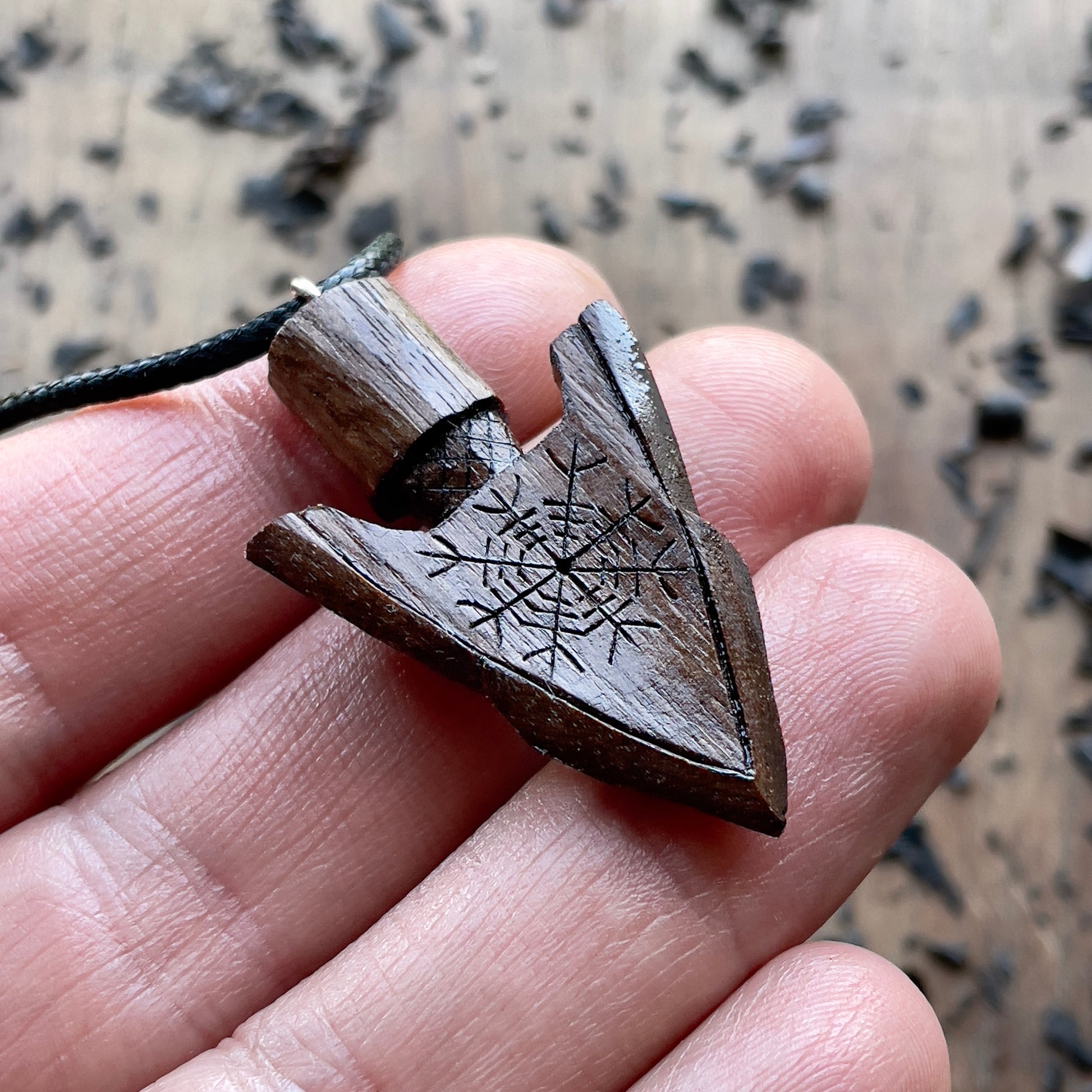 Carved into the surface are three powerful symbols from Norse tradition, each with its own meaning: